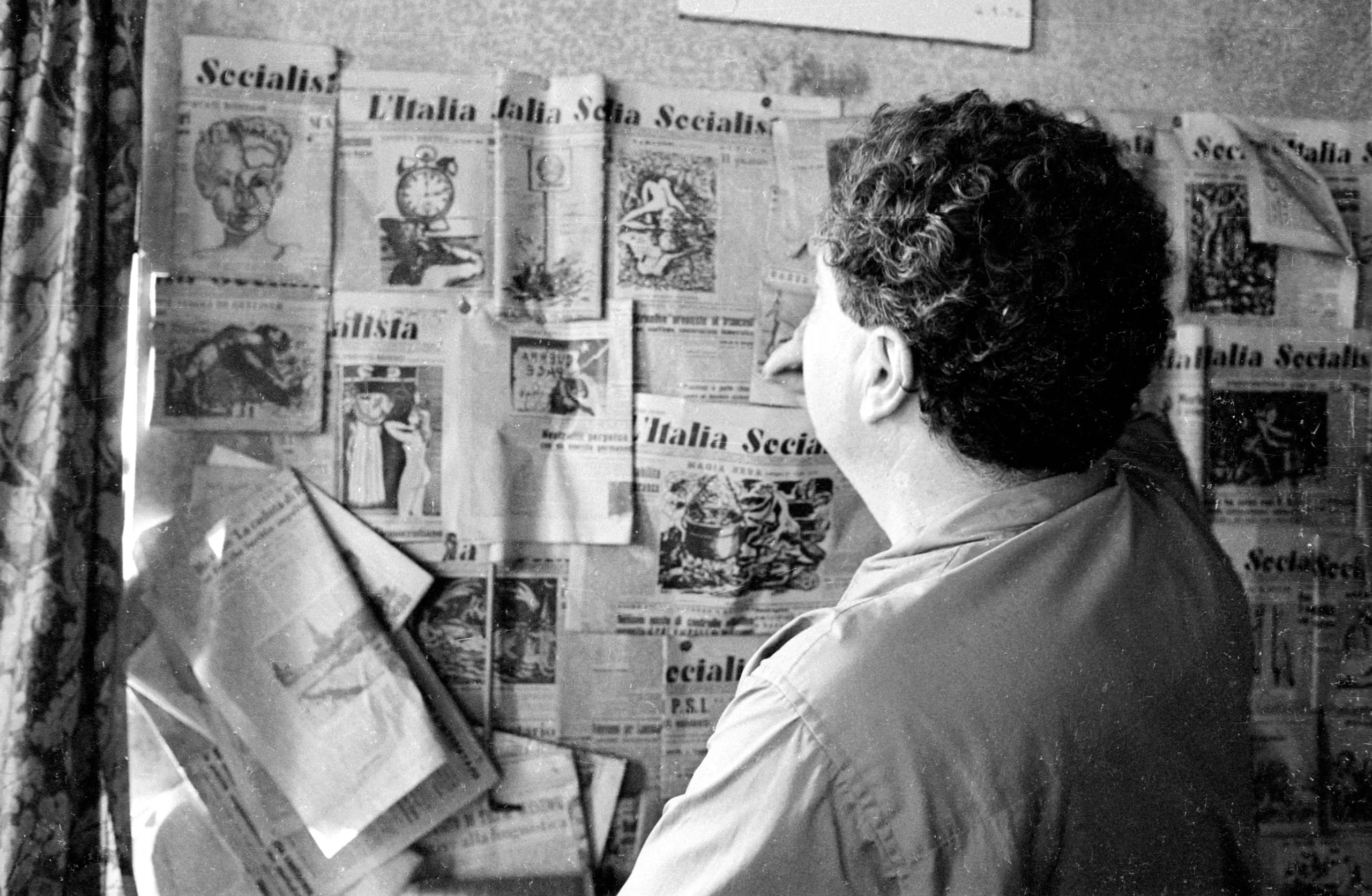 Black and white photograph, a curly-haired person viewed from behind looking at a wall densely covered with Italian-language newspaper pages bearing illustrations and bold mastheads