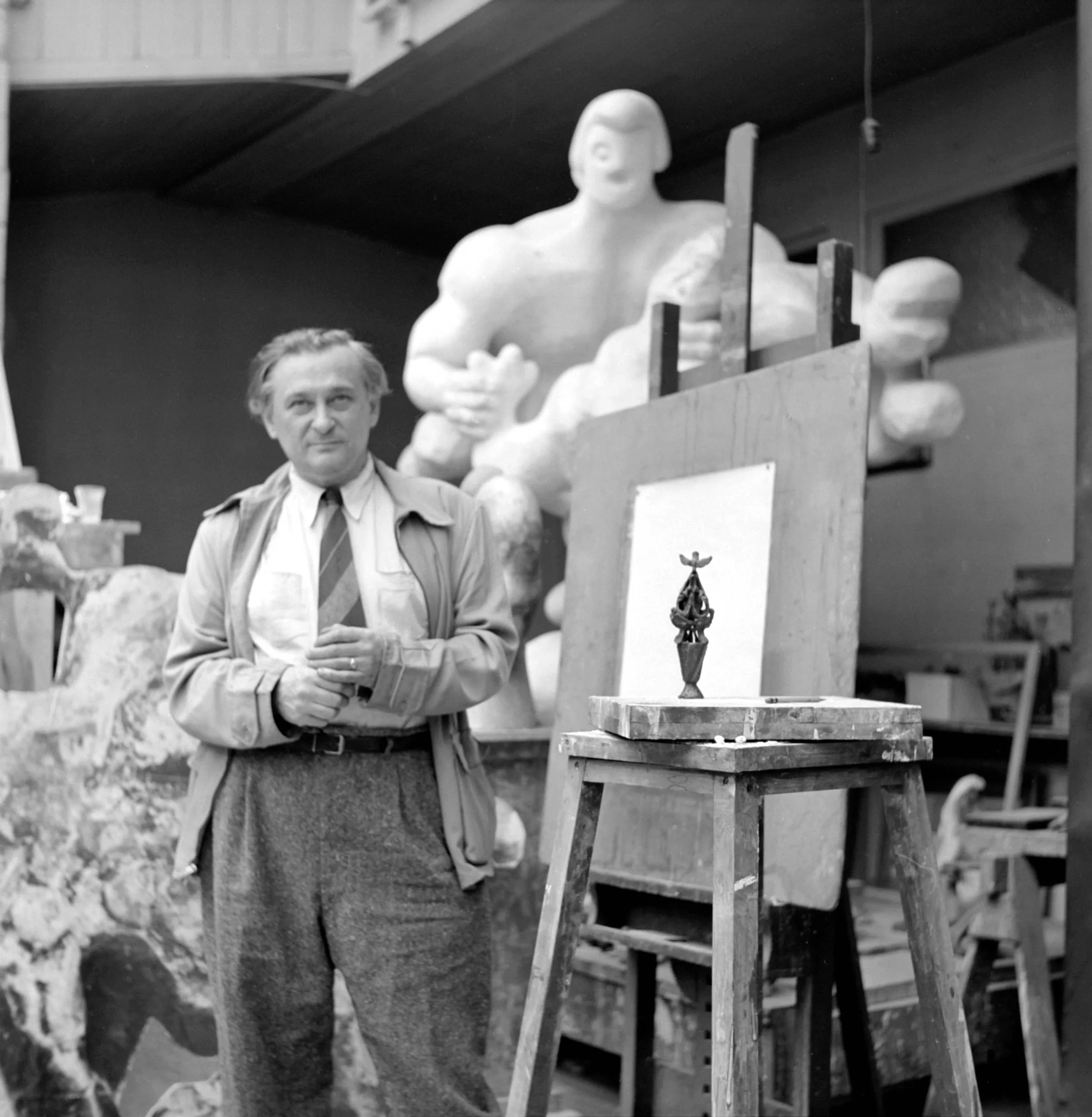 Black and white photograph of a man with crossed arms standing in a sculptor's studio, flanked by a small dark sculpture on a sawhorse and a large white plaster figure behind him