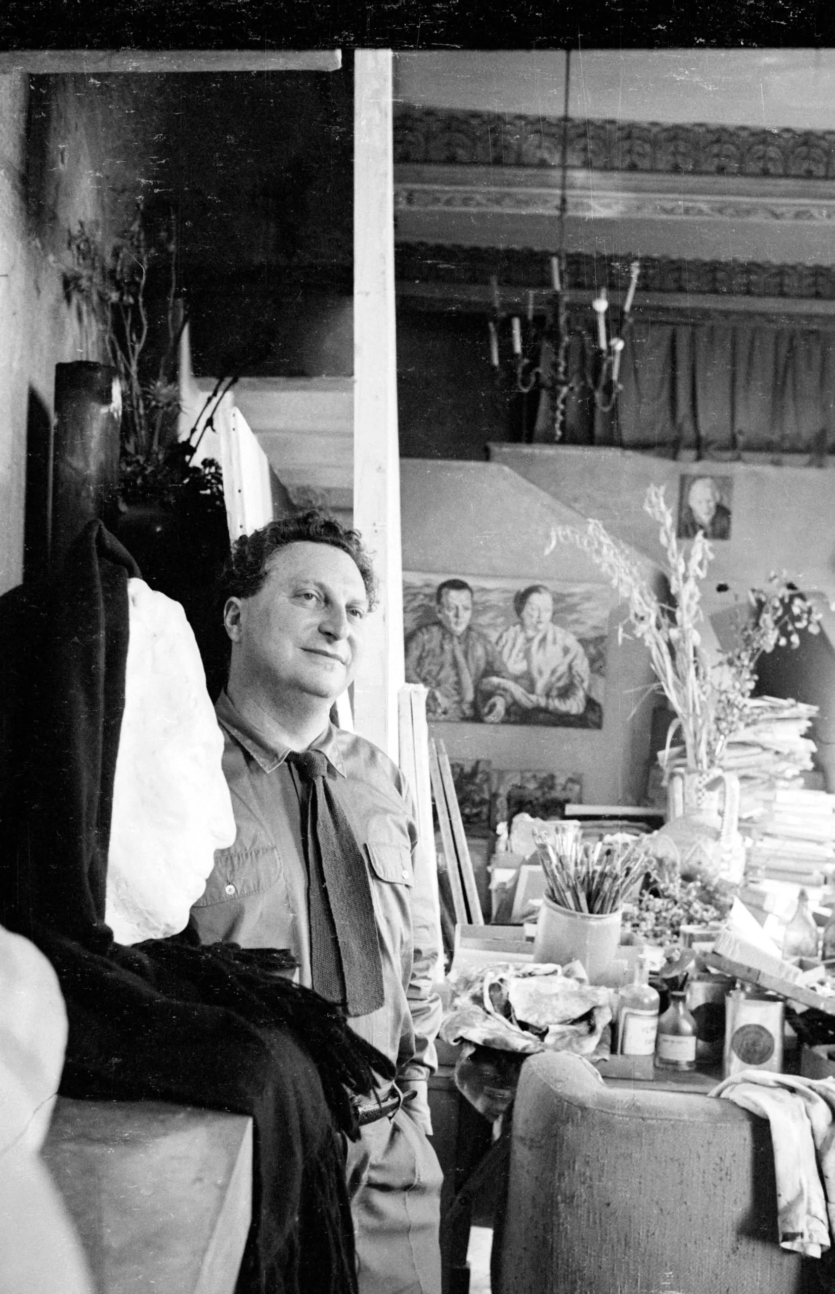 Black and white photograph of a white man seated in an artist's studio, smiling faintly, with paintings, brushes, and cluttered worktables visible behind him