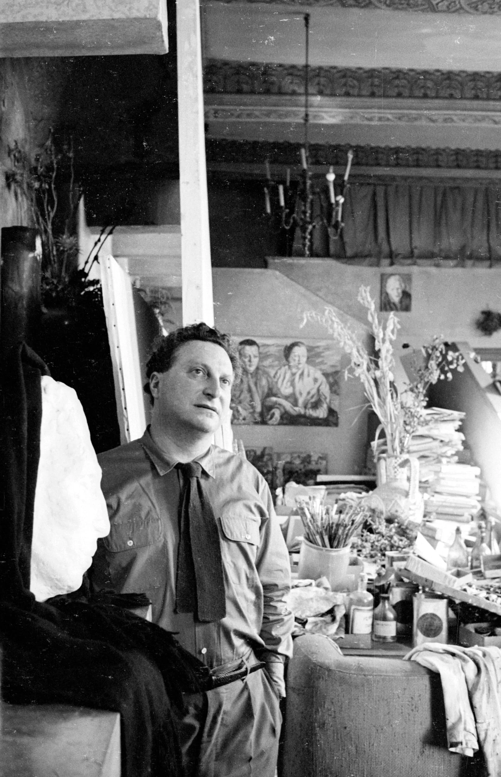 Black and white photograph of a white man seated in a paint-filled artist's studio, surrounded by brushes, bottles, and canvases, looking up and to the left