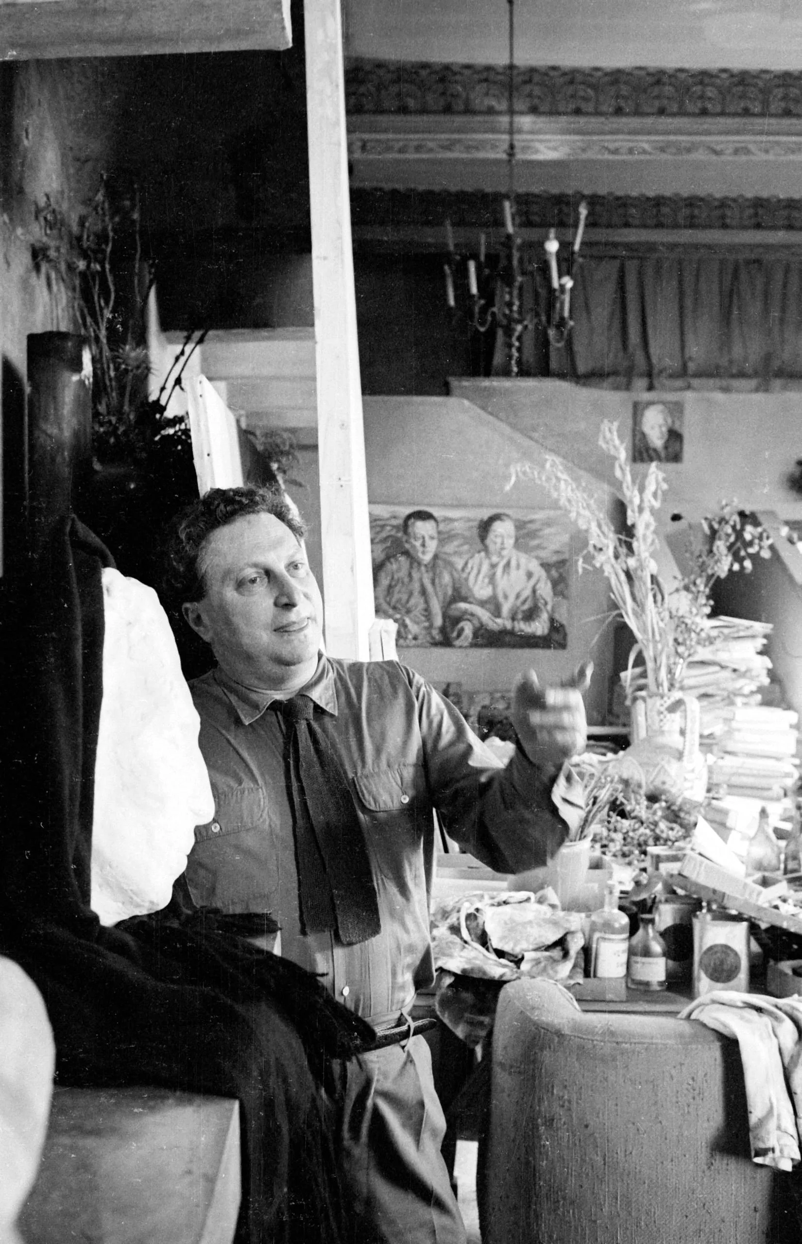 Black and white photograph of a seated white man in a work shirt and loosened tie, gesturing mid-conversation in a cluttered studio with paintings visible in the background