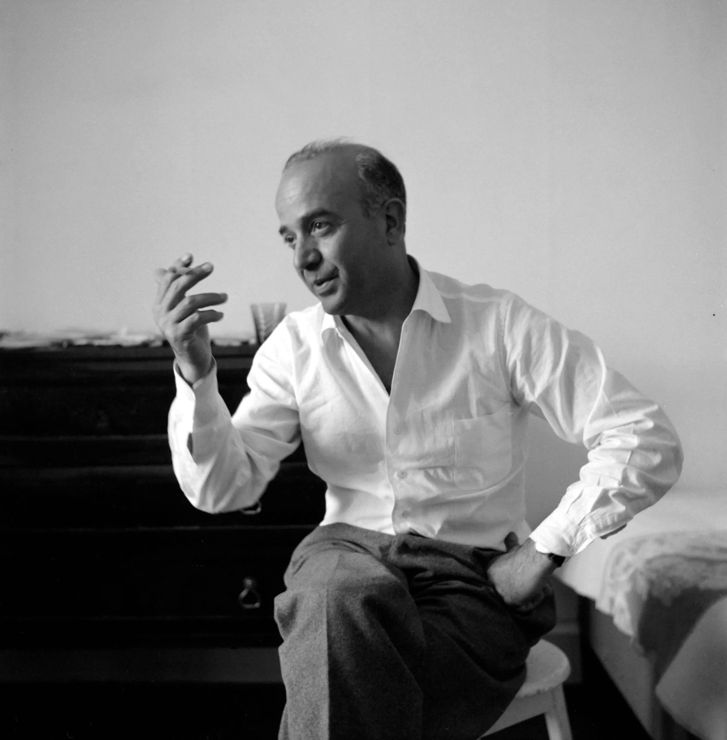 Black and white photograph of a seated man with brown skin in a white dress shirt, turned slightly left, one hand raised mid-gesture, lips parted