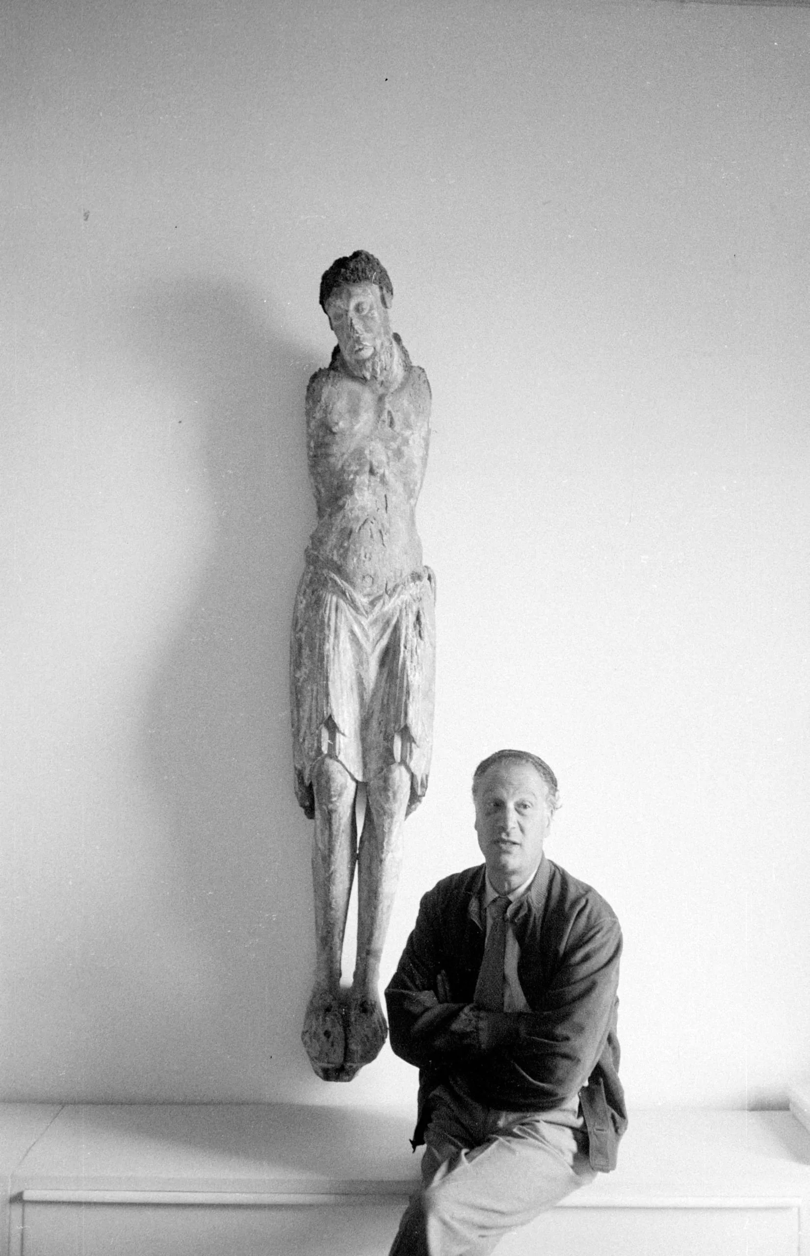 Black and white photograph of a man in a blazer seated on a white ledge, arms crossed, with a large worn wooden figural sculpture mounted on the wall above him