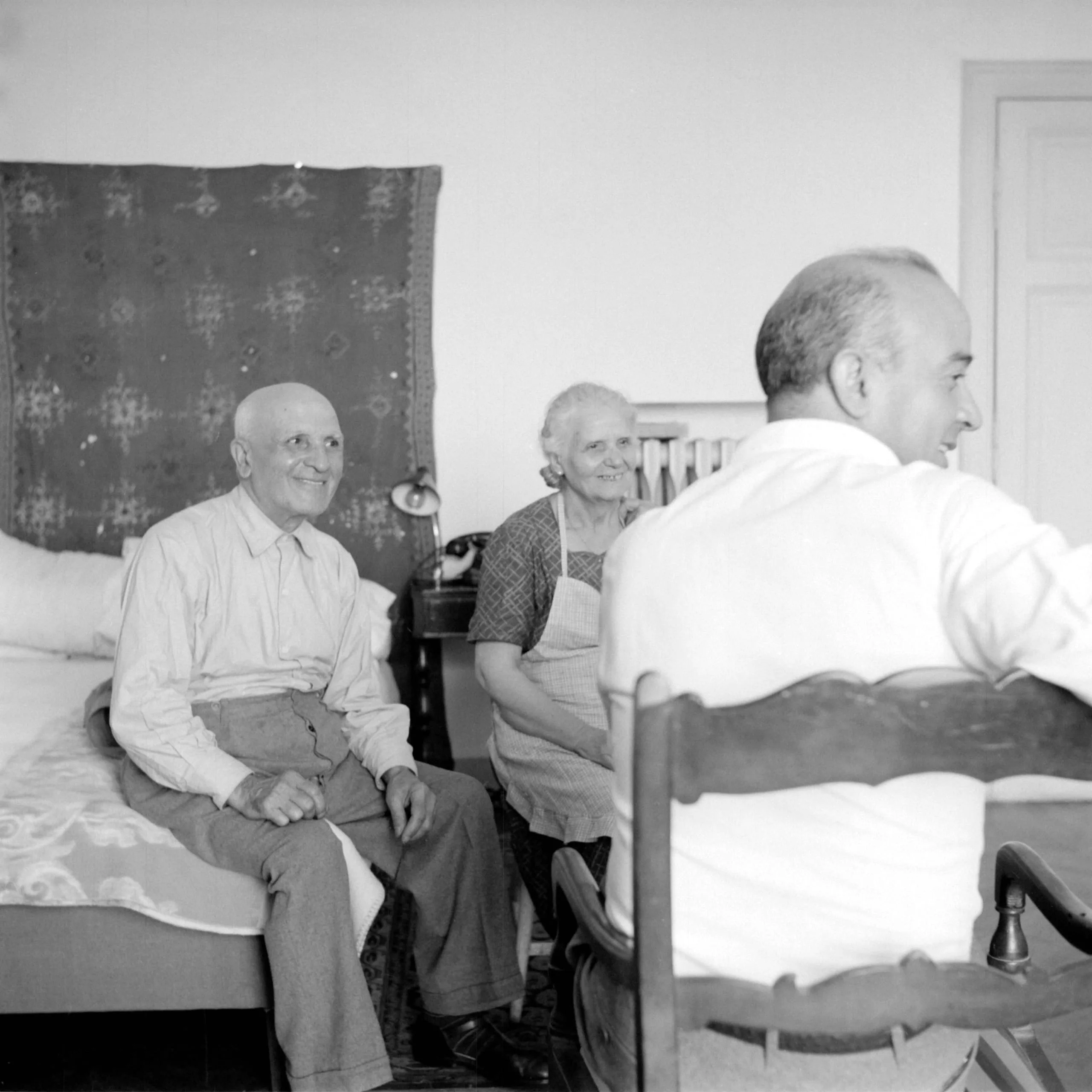 Black and white photograph, three older adults seated in a bedroom — two facing a third whose back is to the camera, soft diffused light
