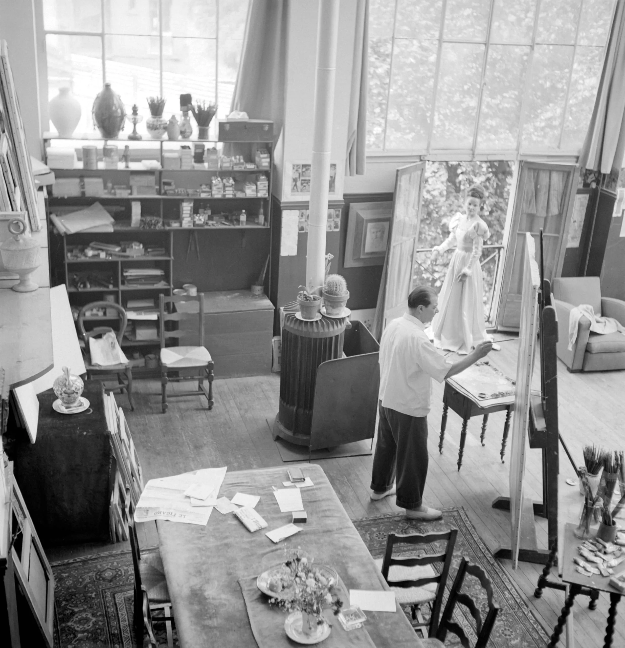 Black and white photograph looking down into an artist's studio, a man painting at an easel while a woman in a white gown poses near tall windows