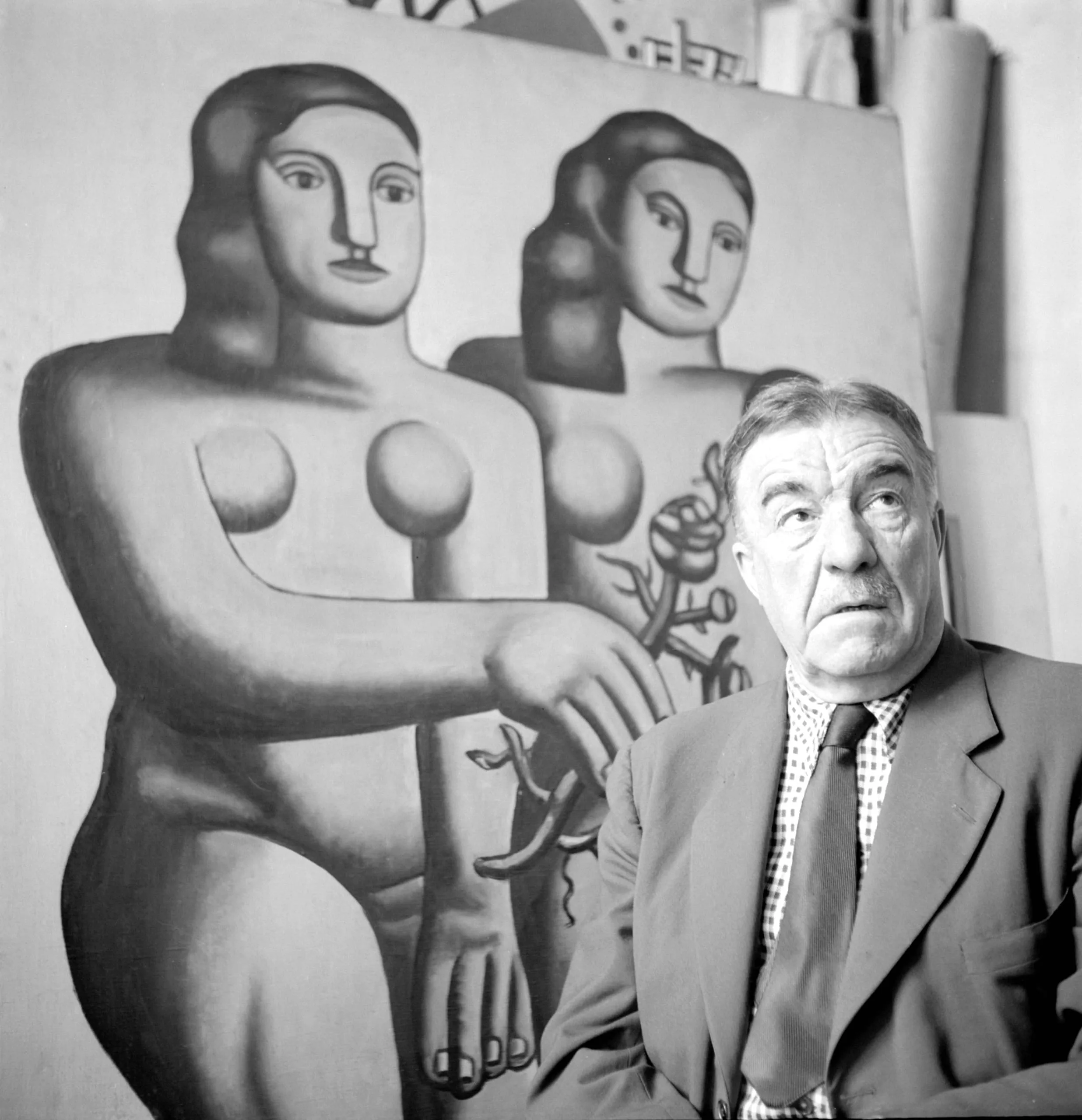 Black and white photograph of an elderly white man in a blazer and tie, seated in front of a large painting depicting two stylized, geometric nude figures