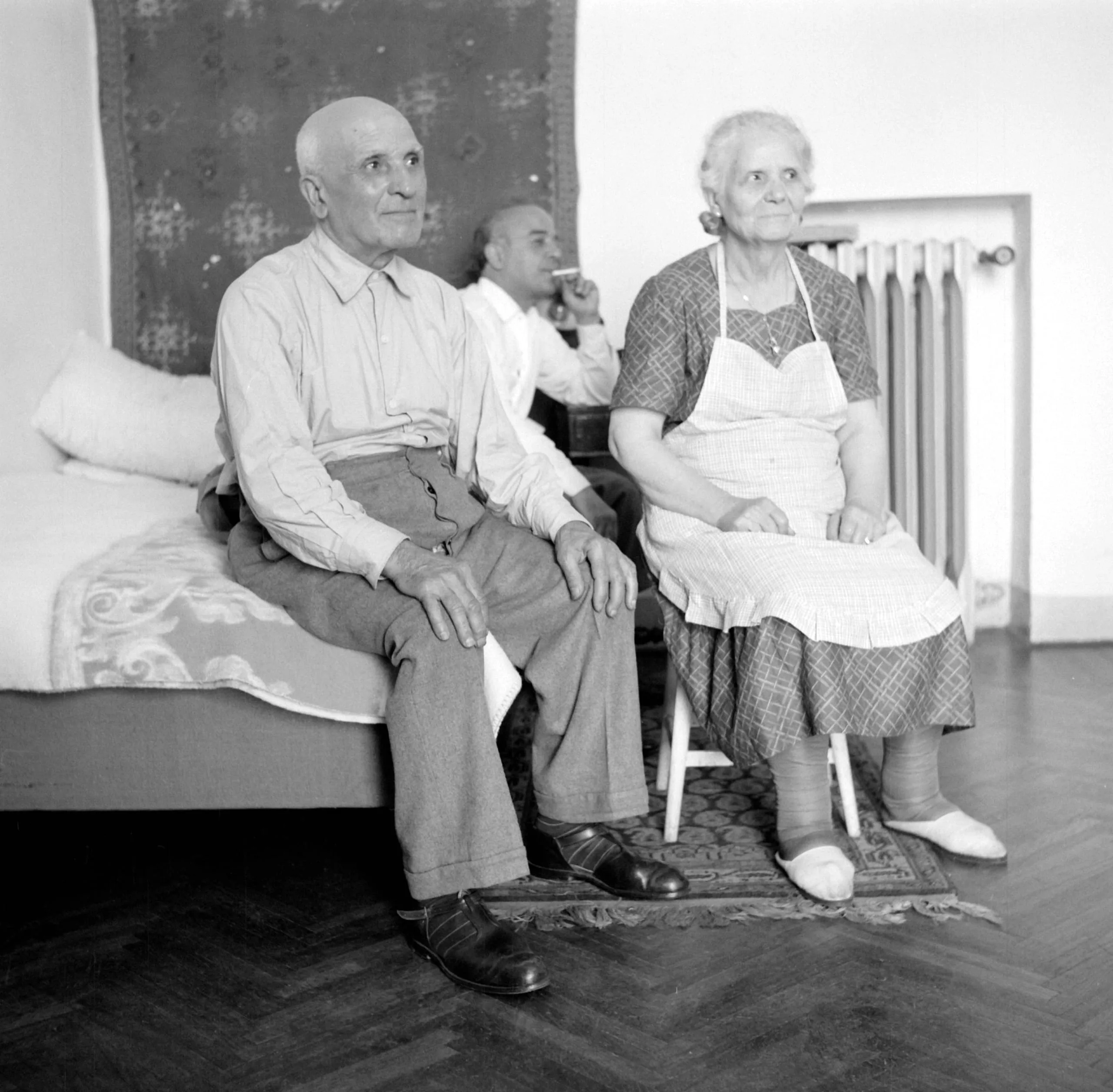 Black and white photograph of two older adults seated in a sparse room, a bald man on a bed's edge and a woman in an apron on a small chair, with a third figure smoking behind them