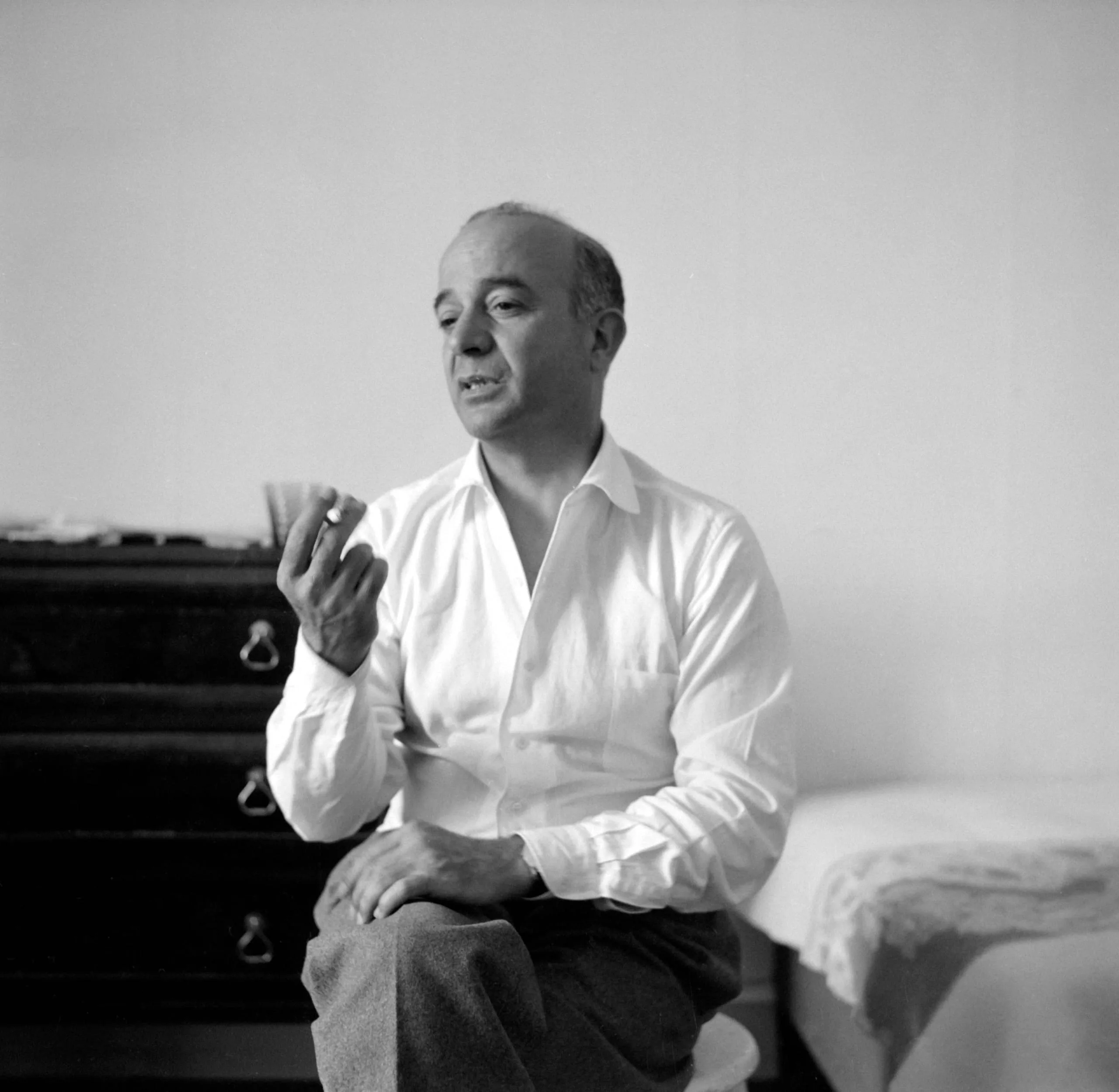 Black and white photograph of a middle-aged man seated, wearing an open-collared white shirt, holding a cigarette with one hand raised, shot in soft diffused light