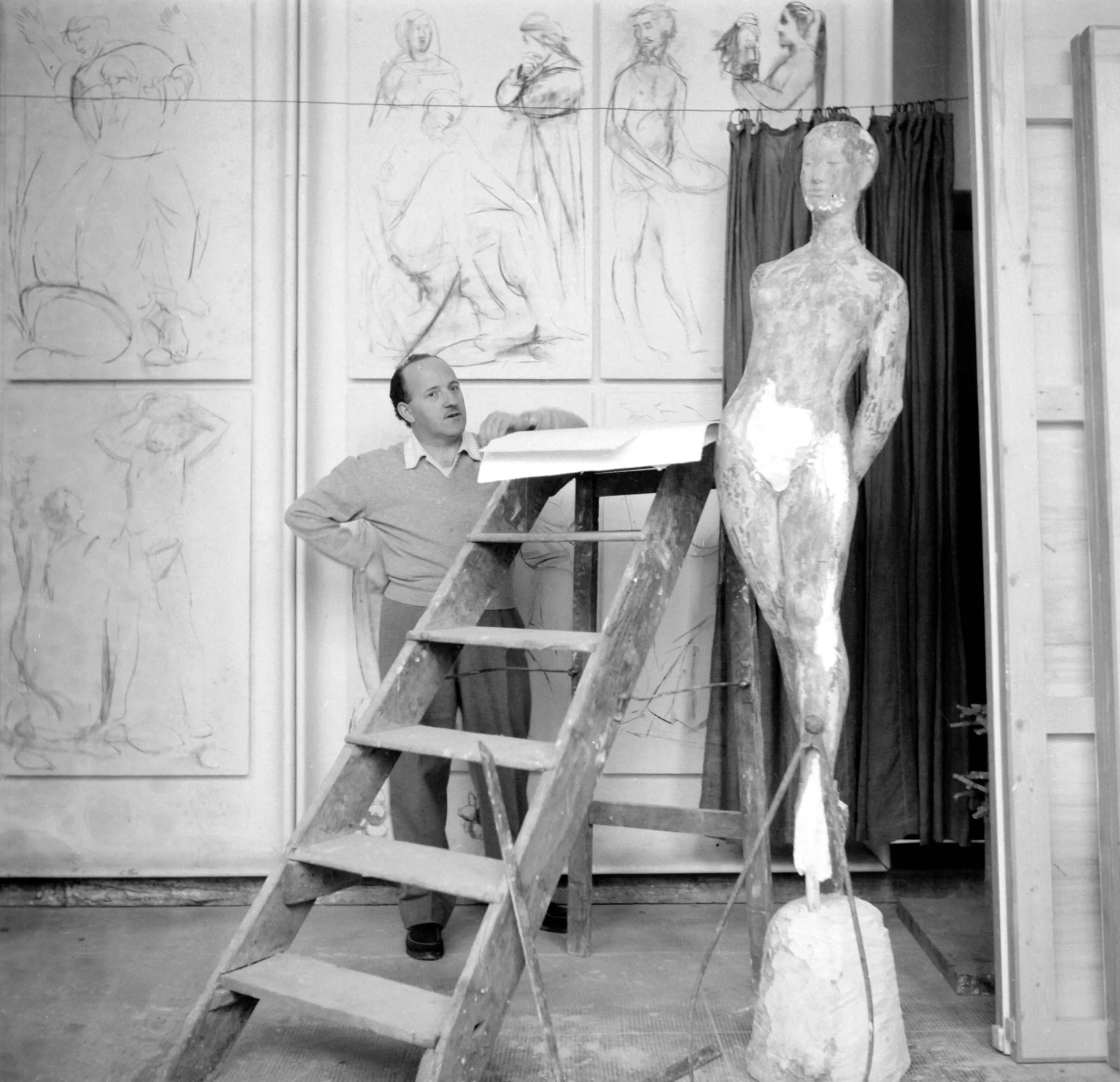Black and white photograph of a man standing on a wooden stepladder in an art studio beside a life-sized plaster nude figure, with large figure drawings on panels behind him