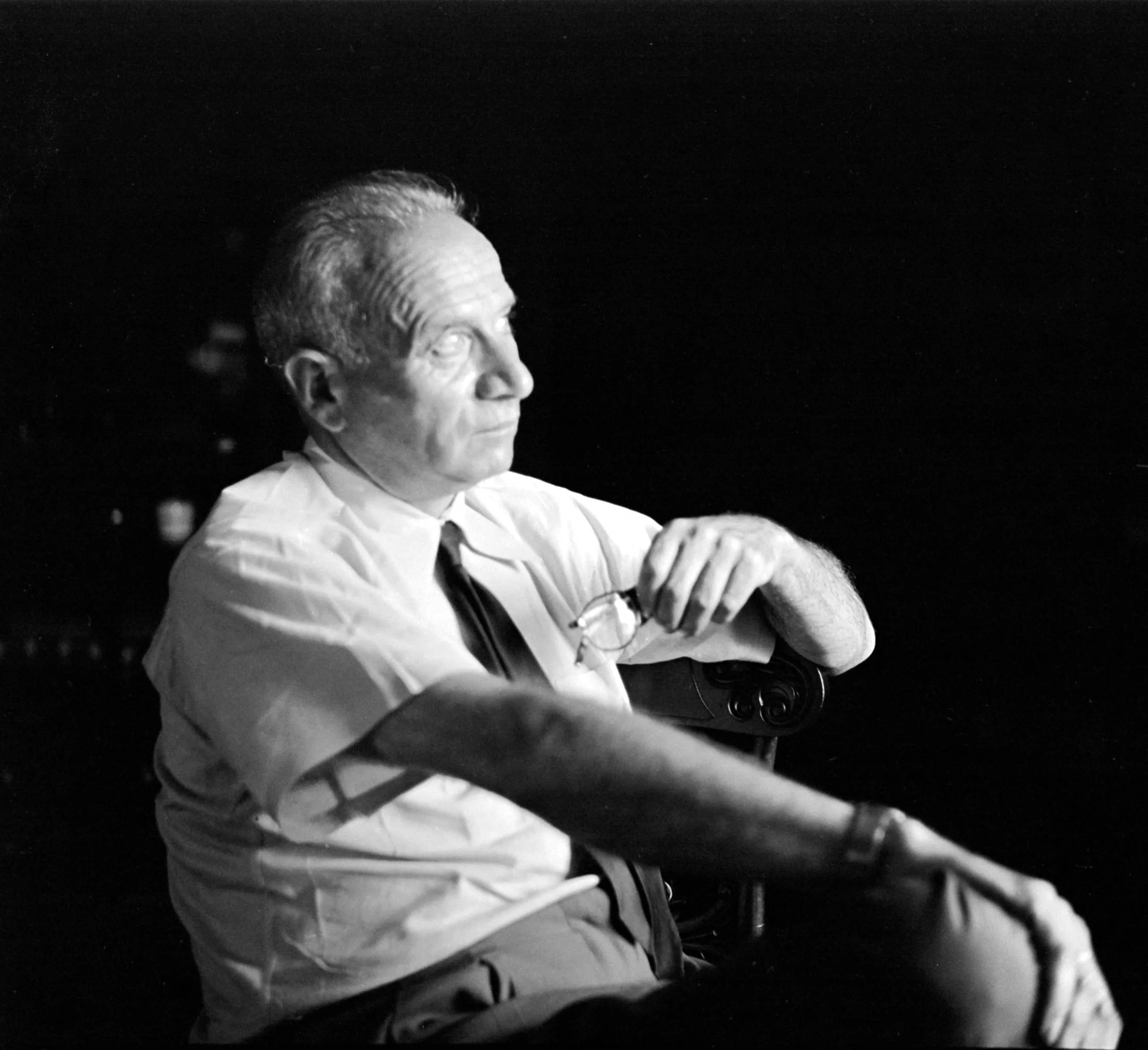 Black and white photograph of an older white man in profile, seated in a wooden chair, wearing a dress shirt and loosened necktie, lit dramatically from the left against a dark background