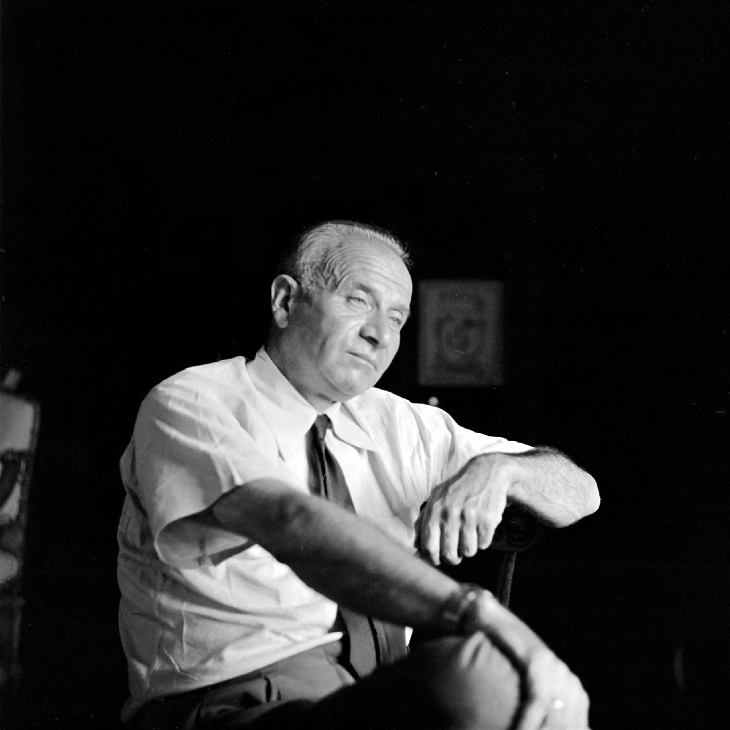 Black and white portrait photograph of a heavyset, pale-skinned older man with short gray hair, seated in a wooden chair, body angled left, lit from the left with deep shadows