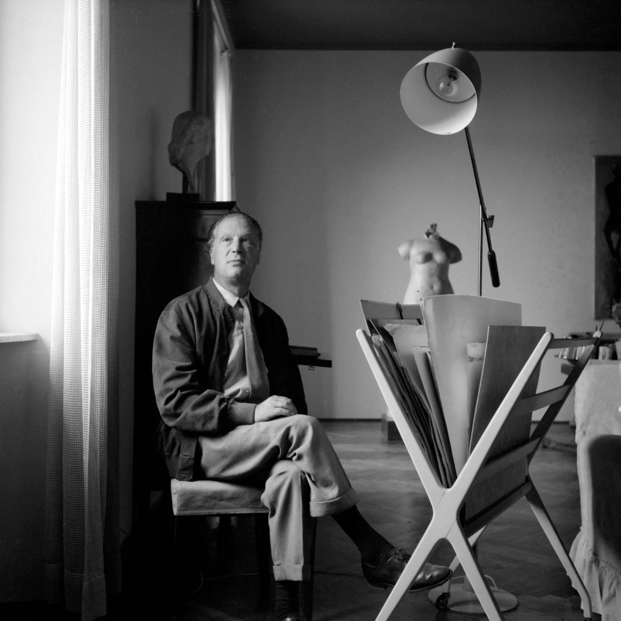 Black and white photograph, a middle-aged man in a dark jacket and tie seated in a studio, surrounded by a portfolio rack, floor lamp, and small sculptural torso