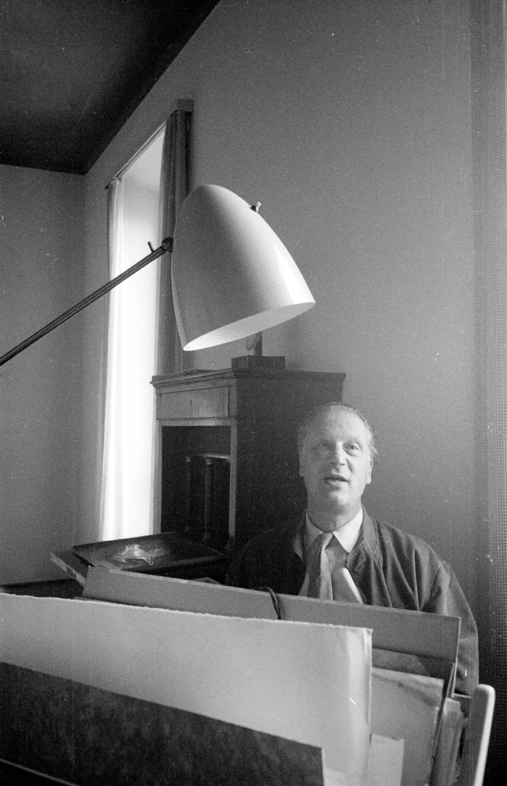 Black and white photograph of a man in a dark smock seated behind a canvas in a studio, gazing upward, with a large cone-shaped lamp overhead