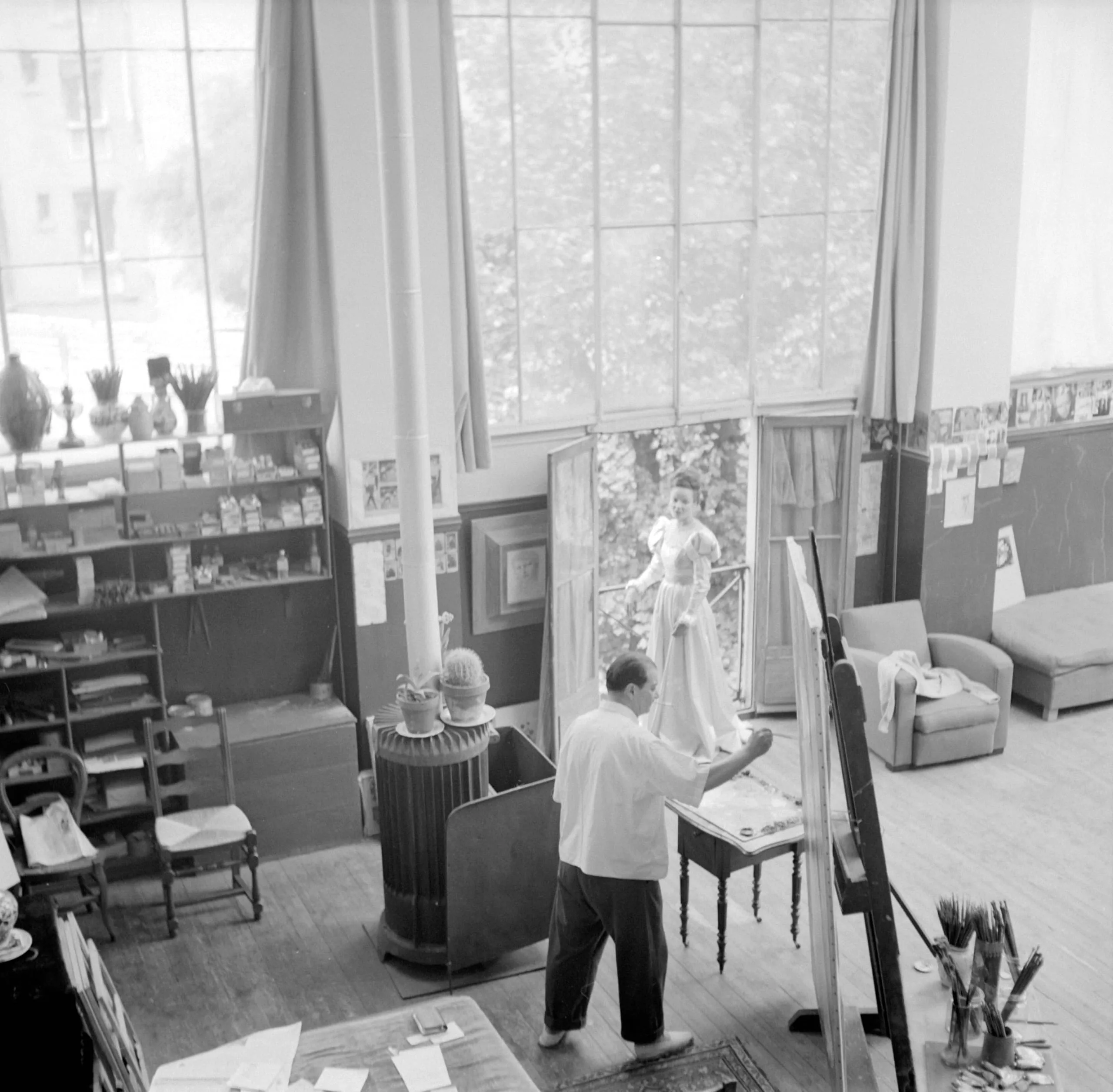 Black and white photograph, elevated view of an artist's studio, a man painting at an easel with a woman in a long dress posing on a balcony beyond