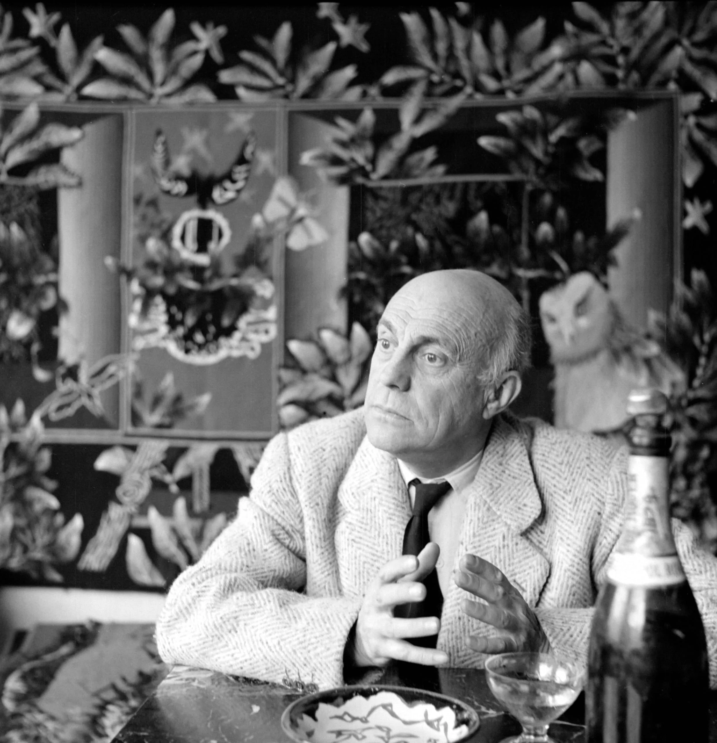 Black and white photograph, a bald man in a tweed jacket and dark tie seated at a table, hands clasped, with a decorative painted screen visible behind him