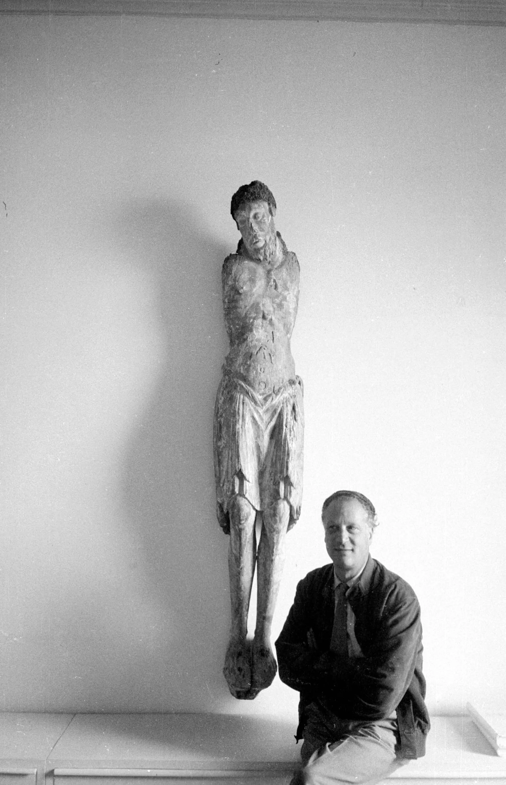 Black and white photograph of a tall, weathered wooden figure sculpture mounted on a wall, depicting a standing male with a loincloth and worn polychrome surface, shown next to a crouching man for scale