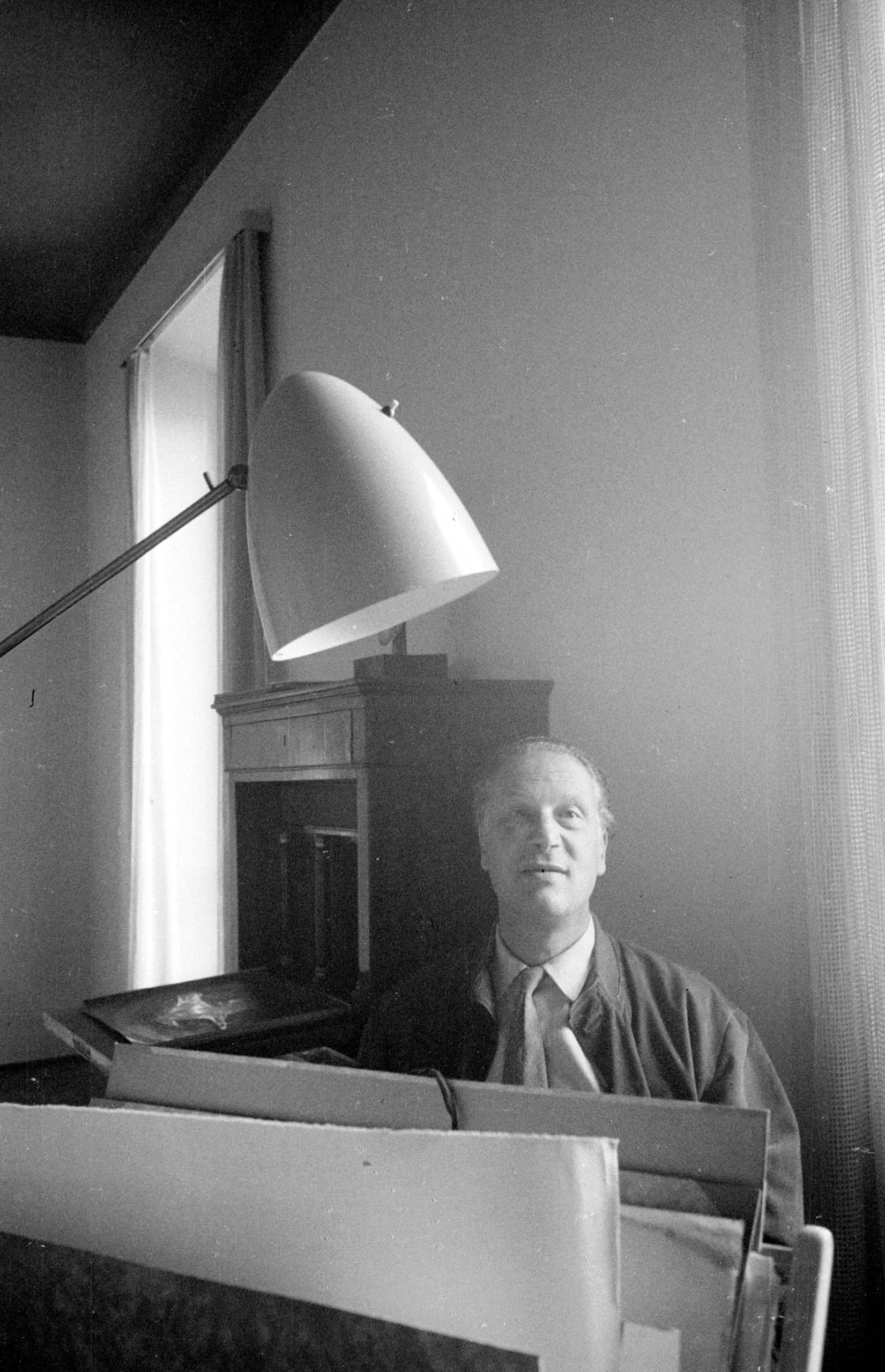 Black and white photograph of a man in a dark jacket and tie seated behind a canvas, looking upward, with a dome-shaped task lamp above his head