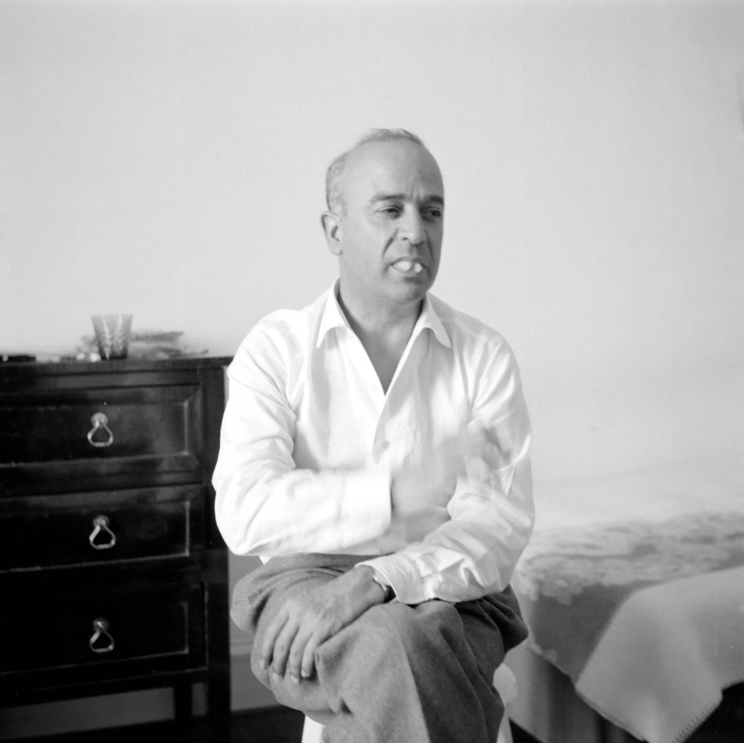 Black and white photograph of a middle-aged man seated on a bed's edge, arms crossed, wearing a white dress shirt, with a dark wooden dresser behind him