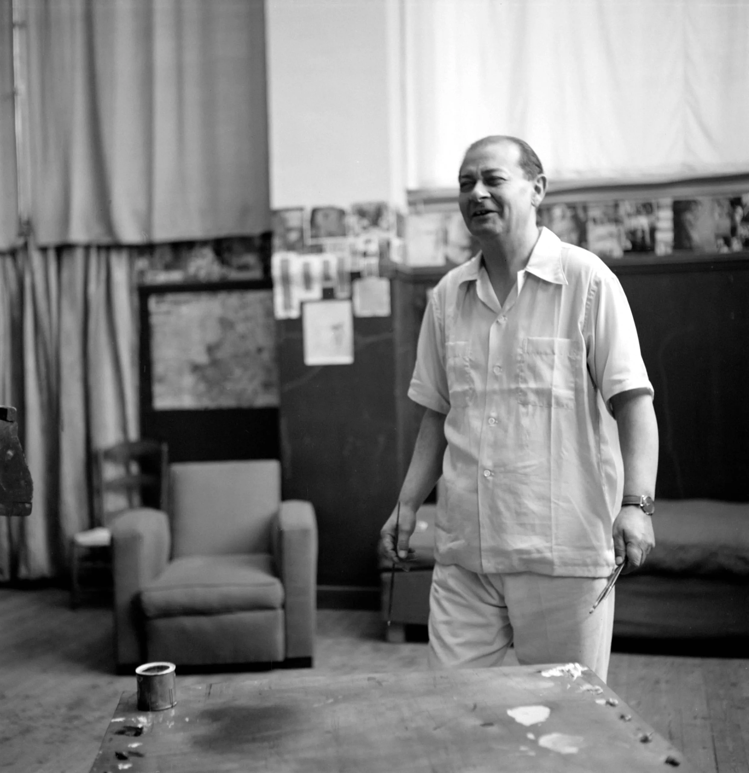 Black and white photograph of a middle-aged man in a short-sleeved button-front shirt standing in an artist's studio, holding a paintbrush, with a paint-covered surface in the foreground