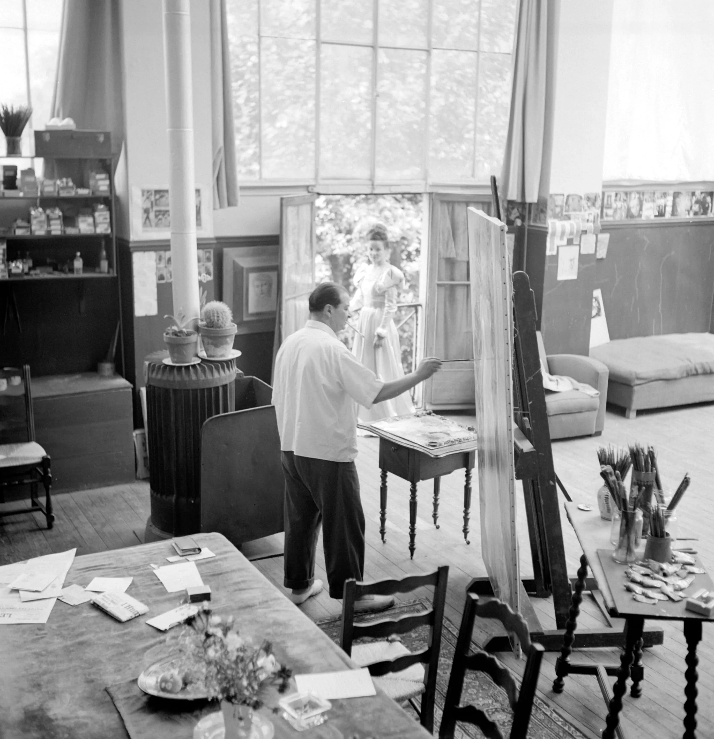 Black and white photograph of an artist's studio, a man painting at a tall easel while a woman in a white dress poses in a sunlit doorway
