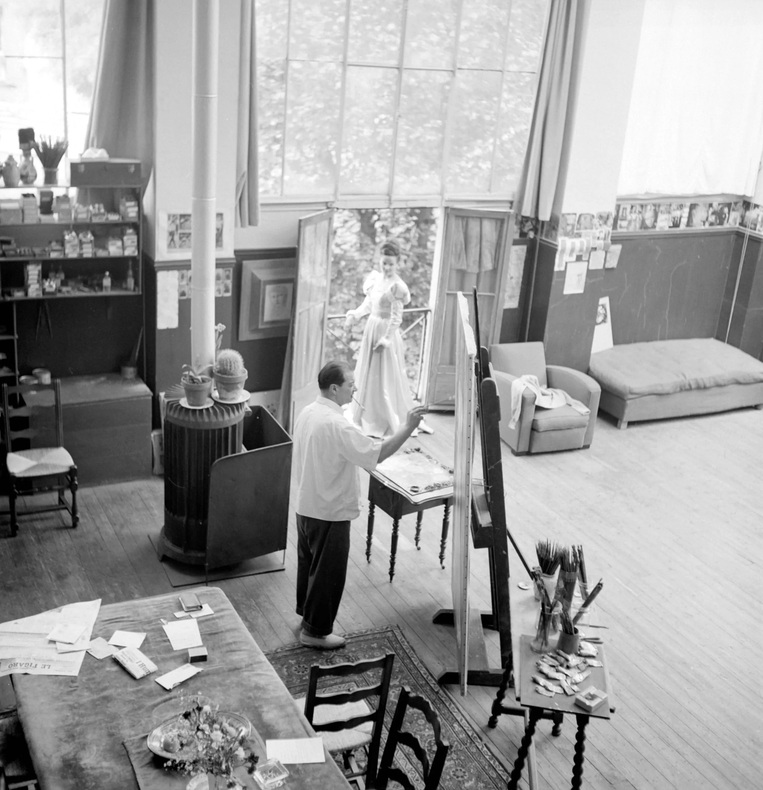 Black and white photograph, elevated view of an artist's studio with a man painting at an easel and a woman in a white gown posing as a model, surrounded by art materials and studio furniture