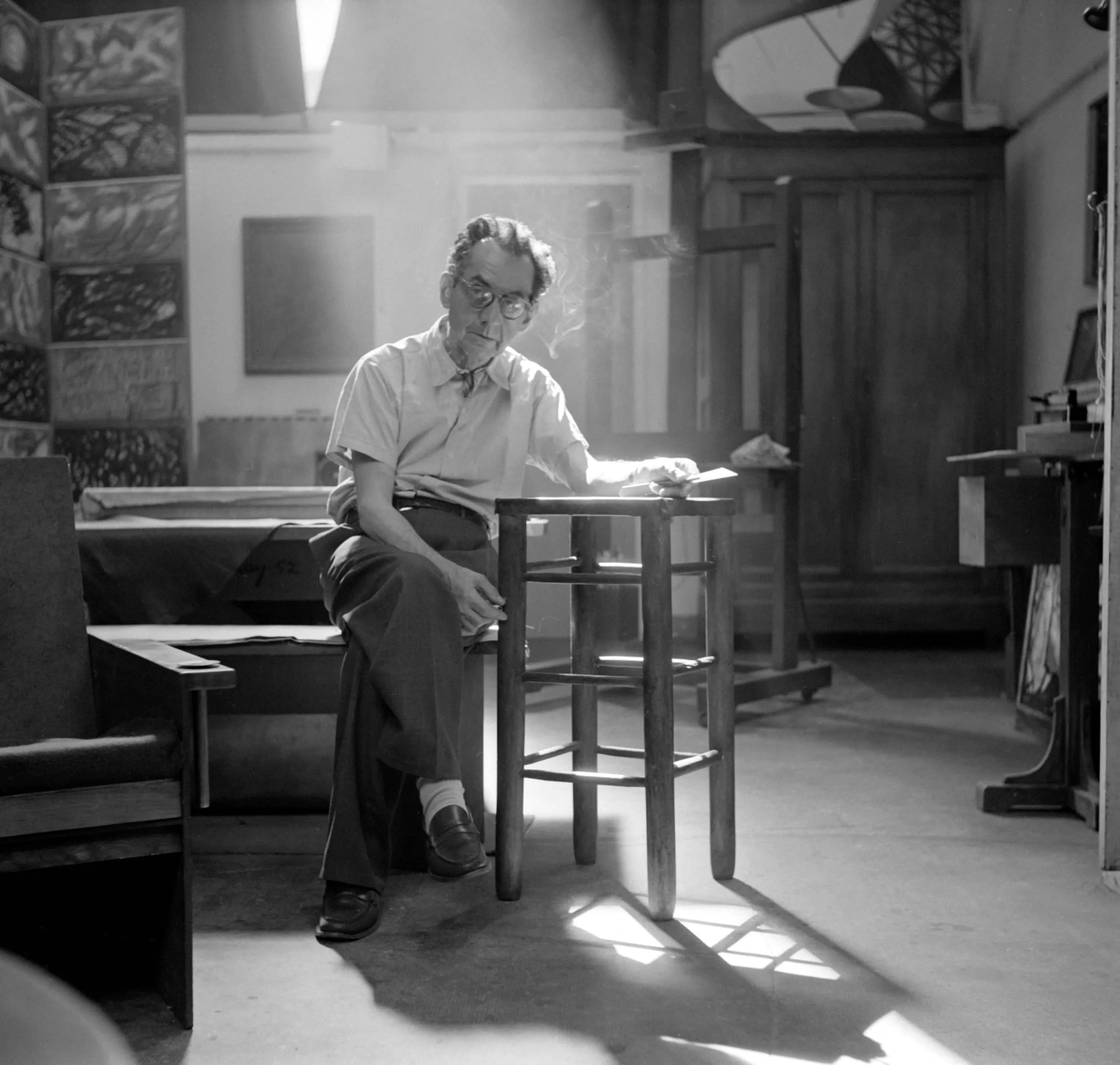 Black and white photograph of a man seated on a wooden stool in an artist's studio, looking down, smoking, surrounded by paintings and artwork on the walls