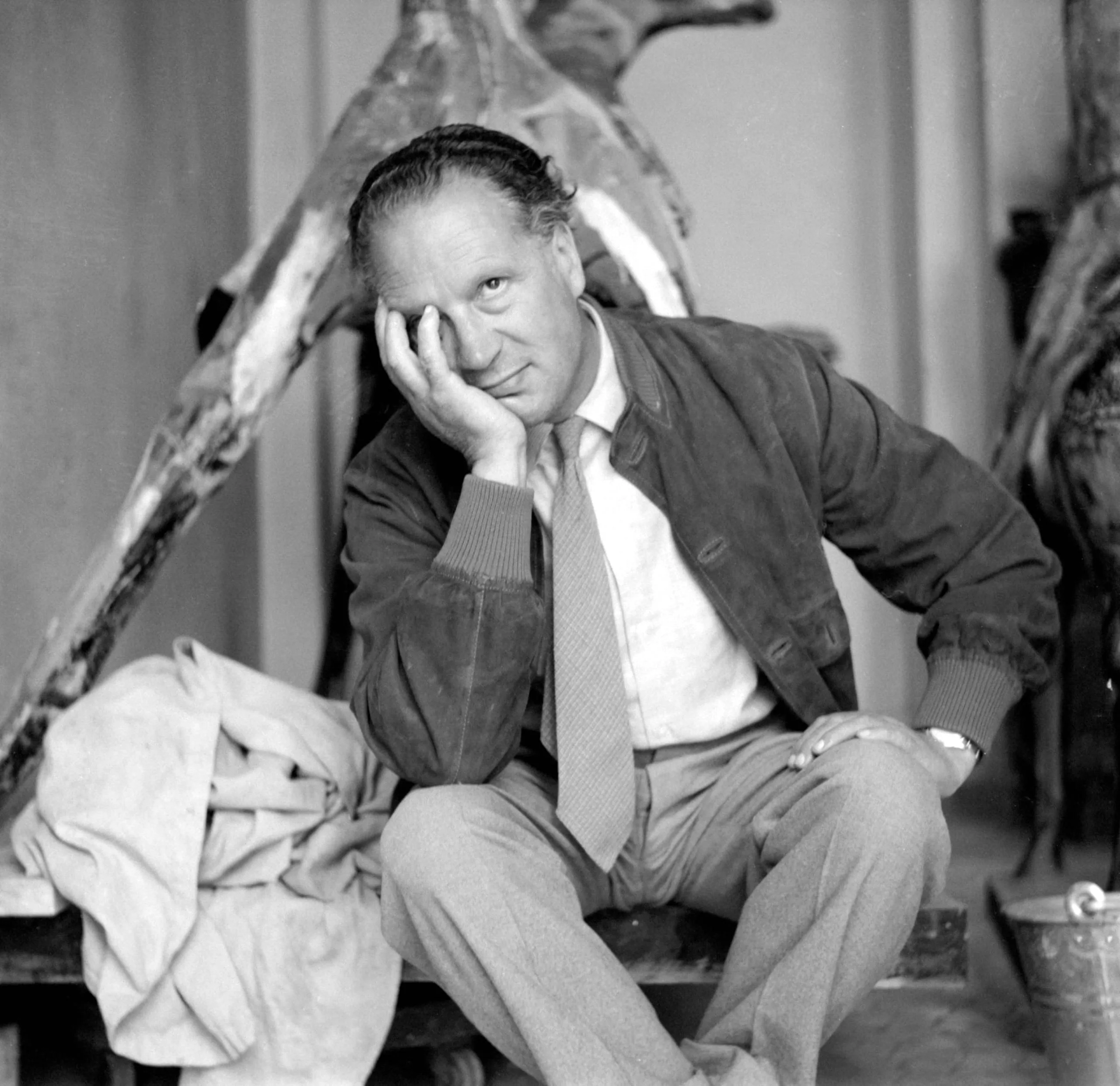 Black and white photograph of a seated man in a jacket and tie, chin resting in hand, with large abstract sculptural forms visible behind him