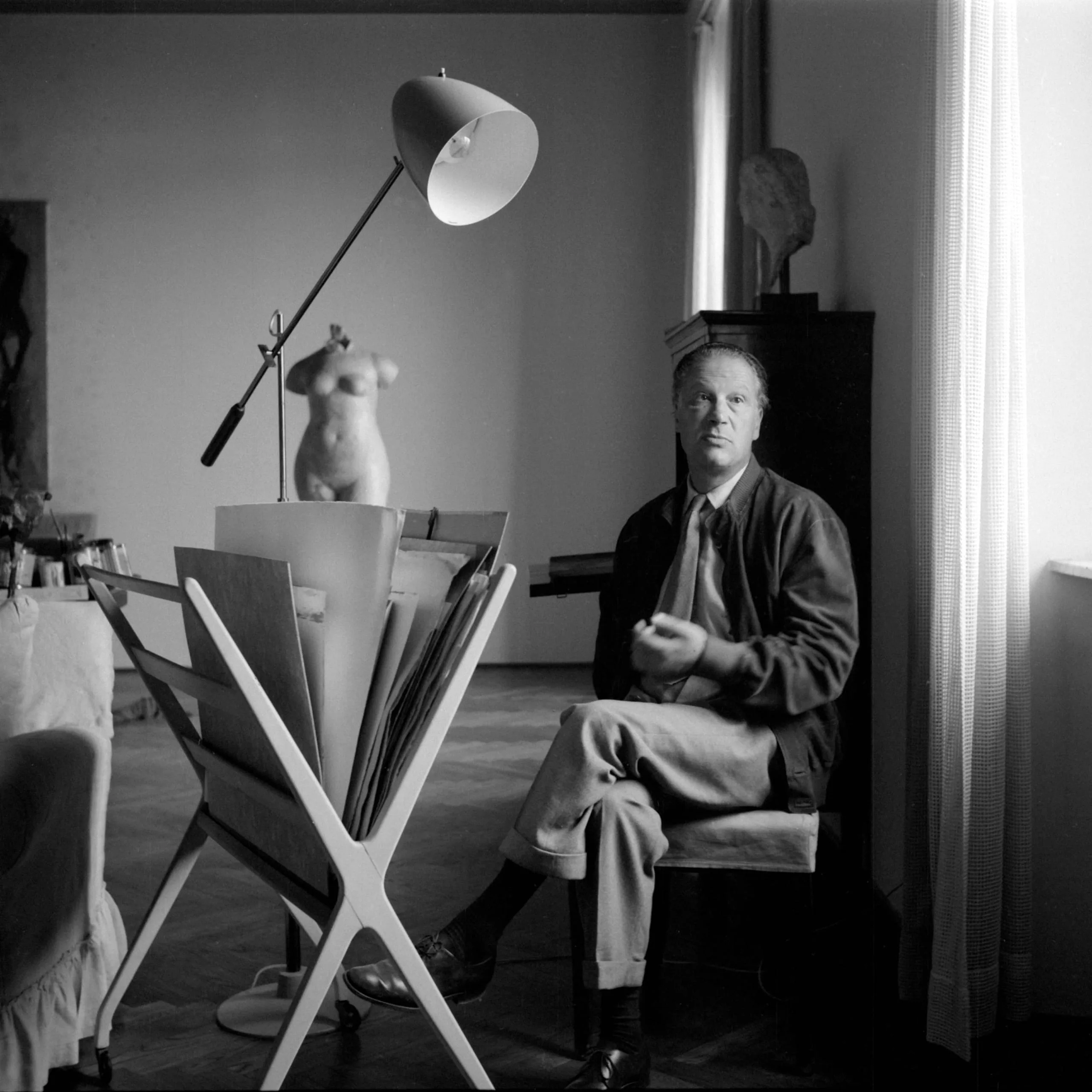 Black and white photograph of a man in a jacket and tie seated in a chair inside a studio, surrounded by a floor lamp, a print rack, and small figurative sculptures
