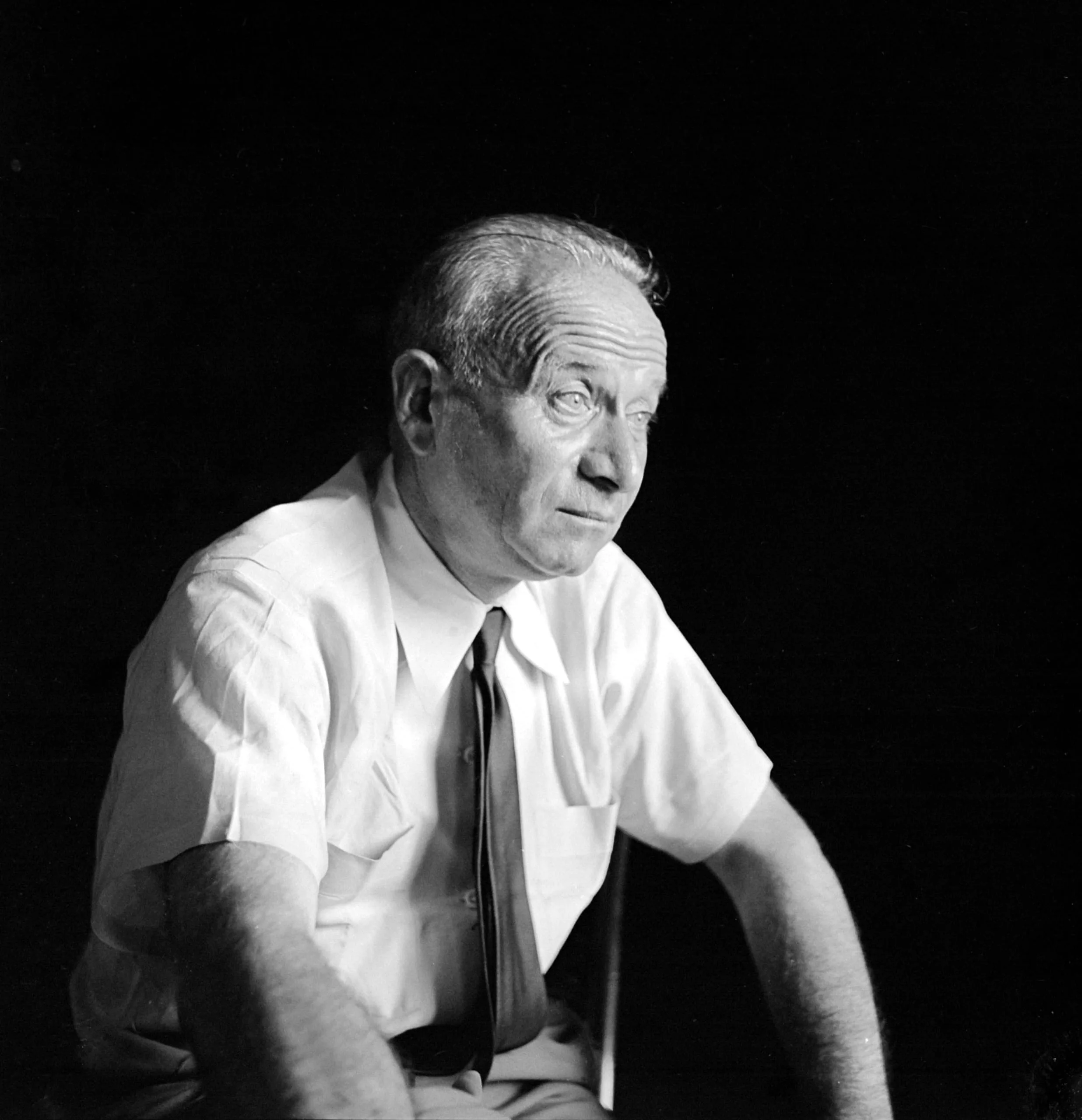 Black and white portrait photograph of an older man in a white short-sleeved shirt and dark tie, leaning forward, lit dramatically from the left against a black background