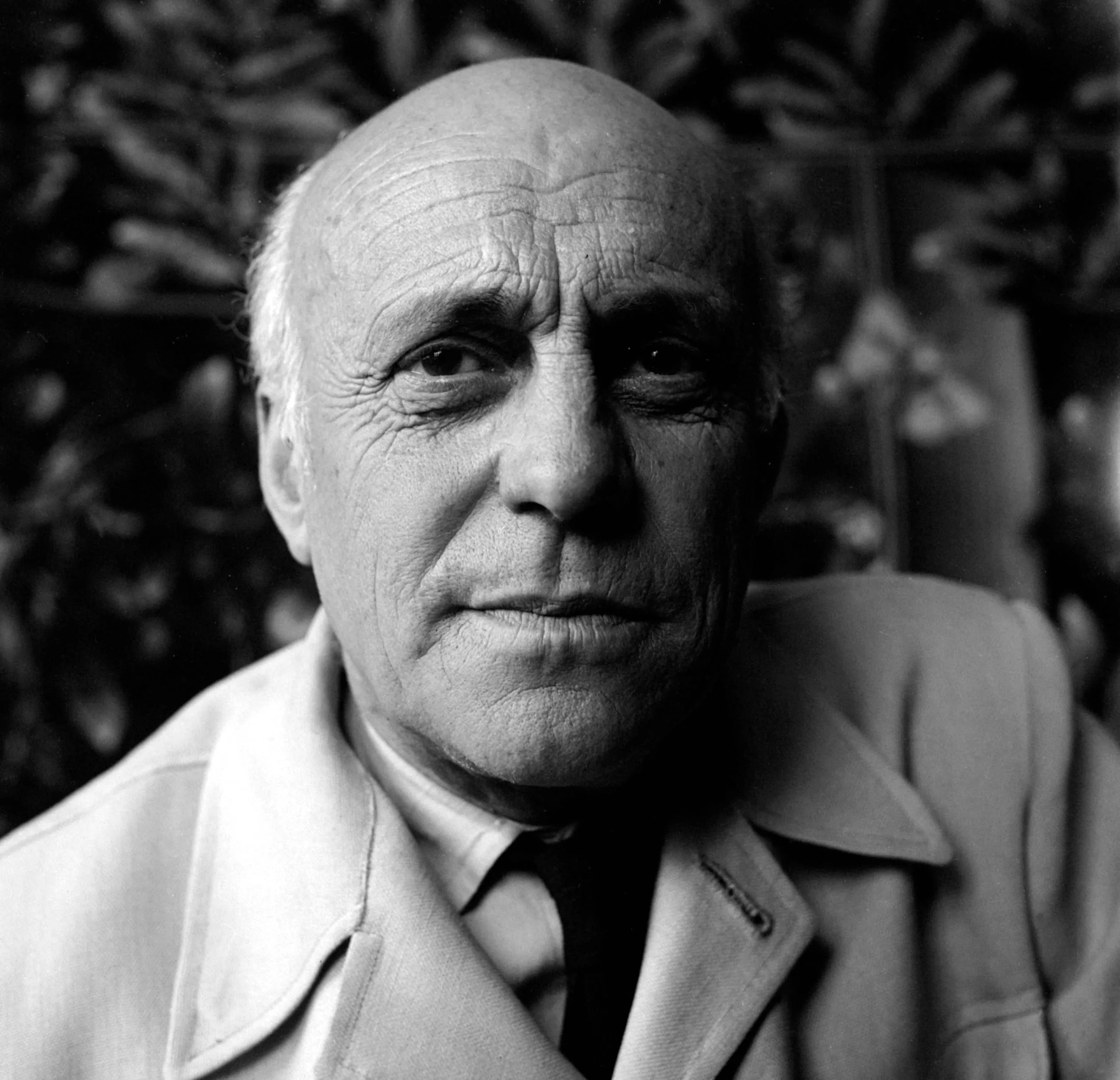 Black and white portrait photograph of an elderly bald man with deeply lined skin, looking directly at the camera, wearing a light jacket and dark tie, with blurred foliage behind him