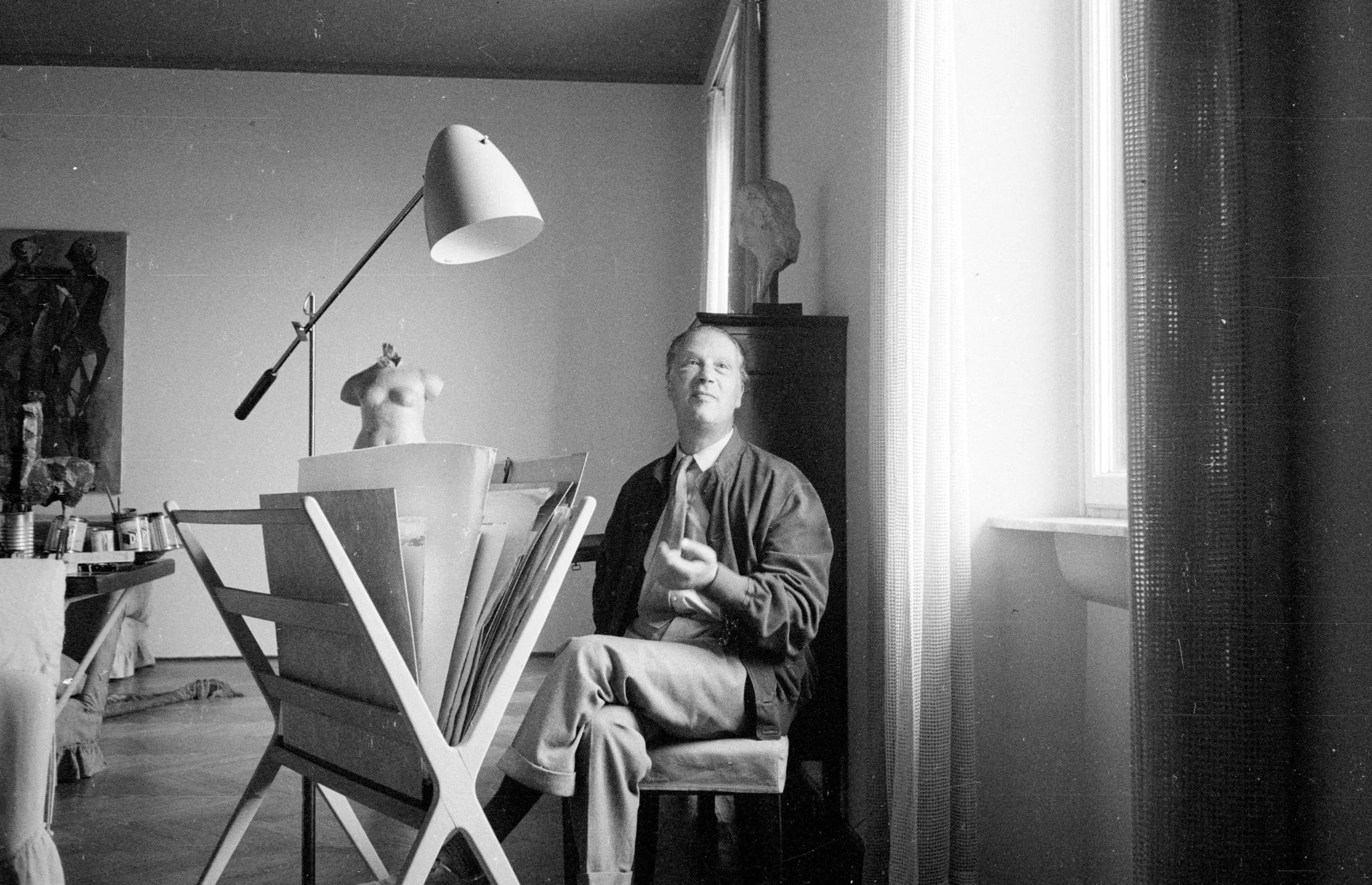 Black and white photograph of a seated white man in a jacket and glasses, head tilted back, inside an artist's studio with sculptures, a floor lamp, and an open portfolio rack
