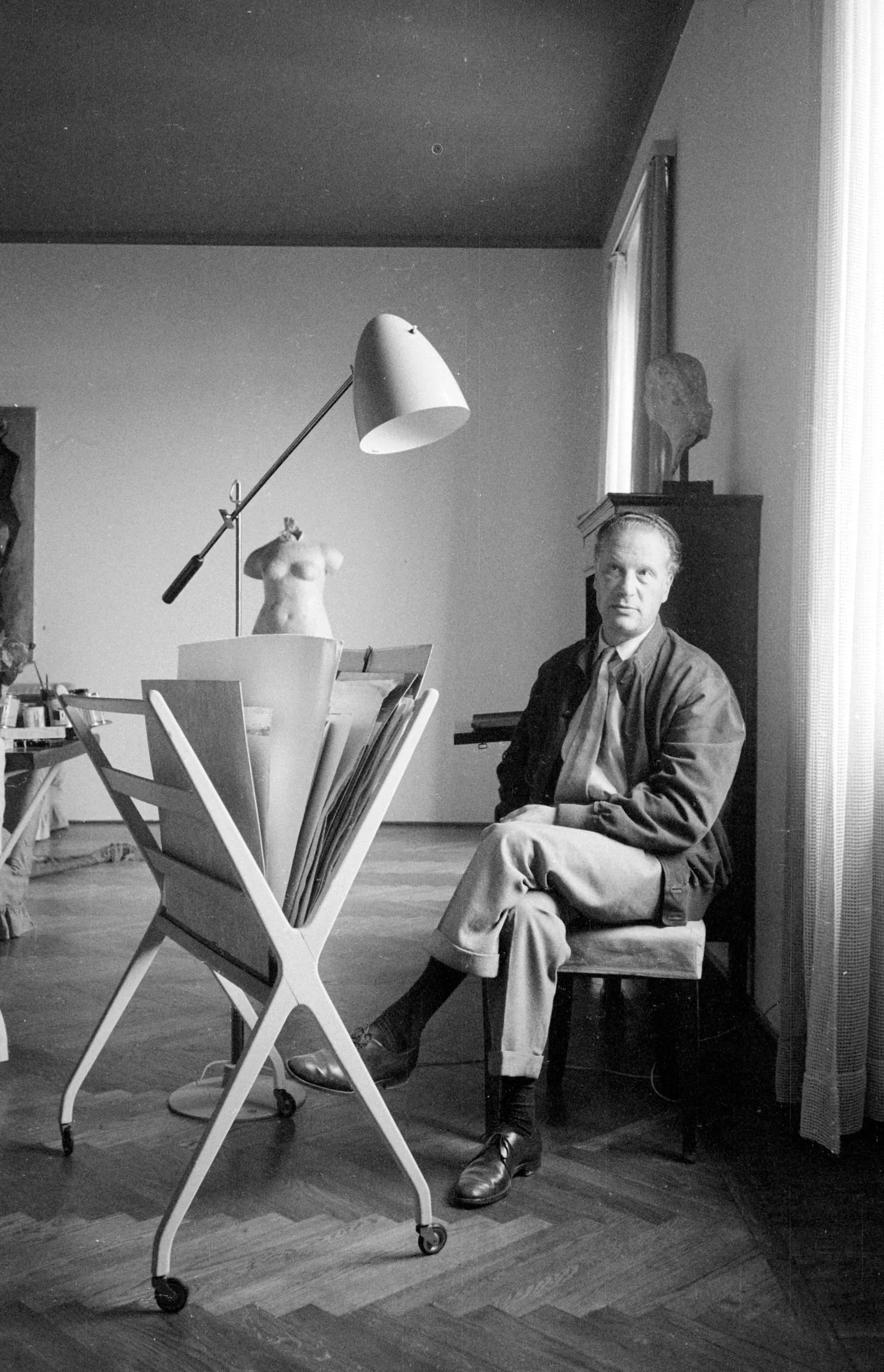 Black and white photograph of a man in a sport coat seated with arms crossed in an artist's studio, surrounded by a portfolio stand, floor lamp, and small sculptures