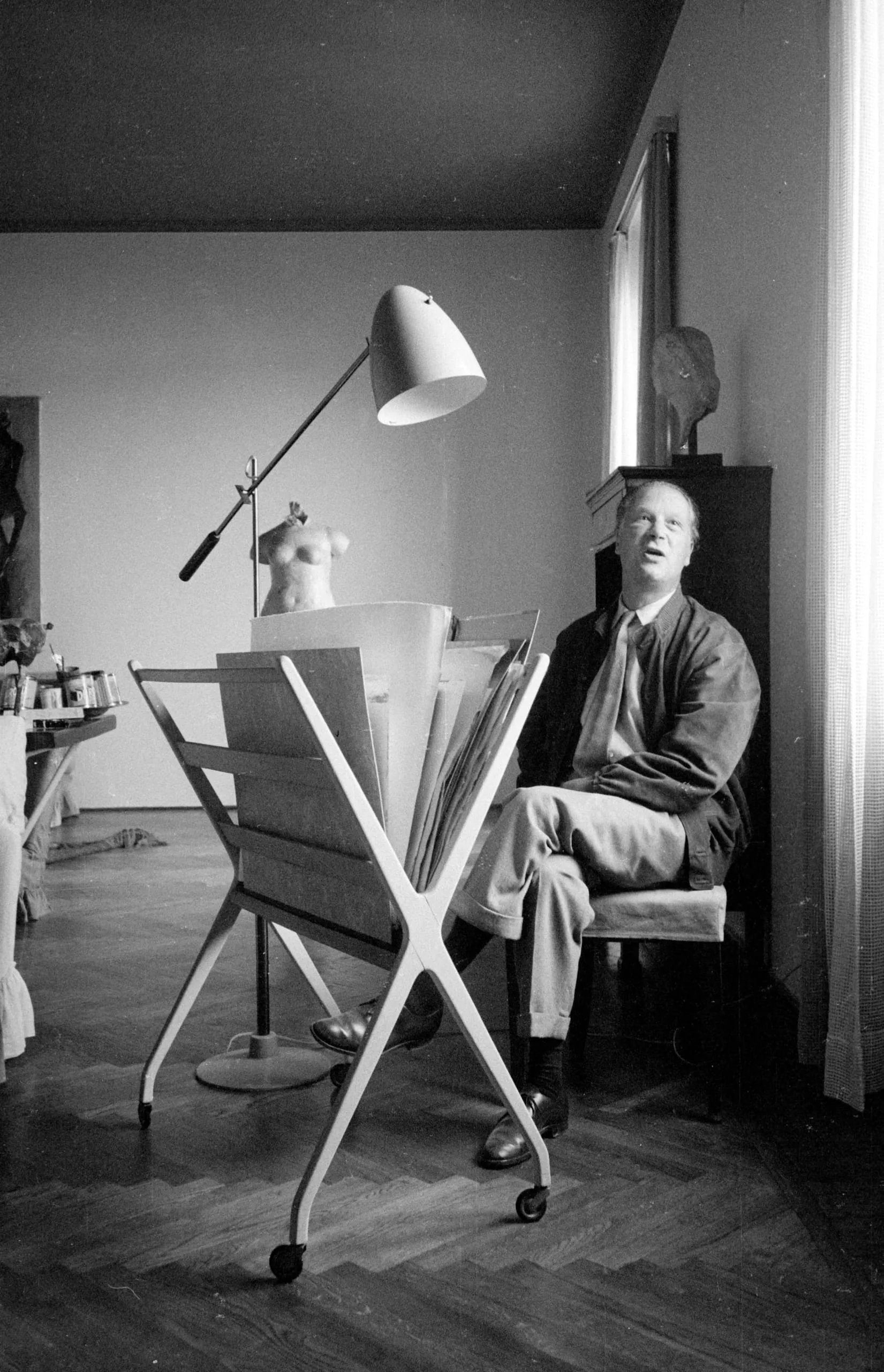 Black and white photograph of a man seated in an artist's studio beside a wheeled drafting easel with an adjustable lamp and small sculptural torso
