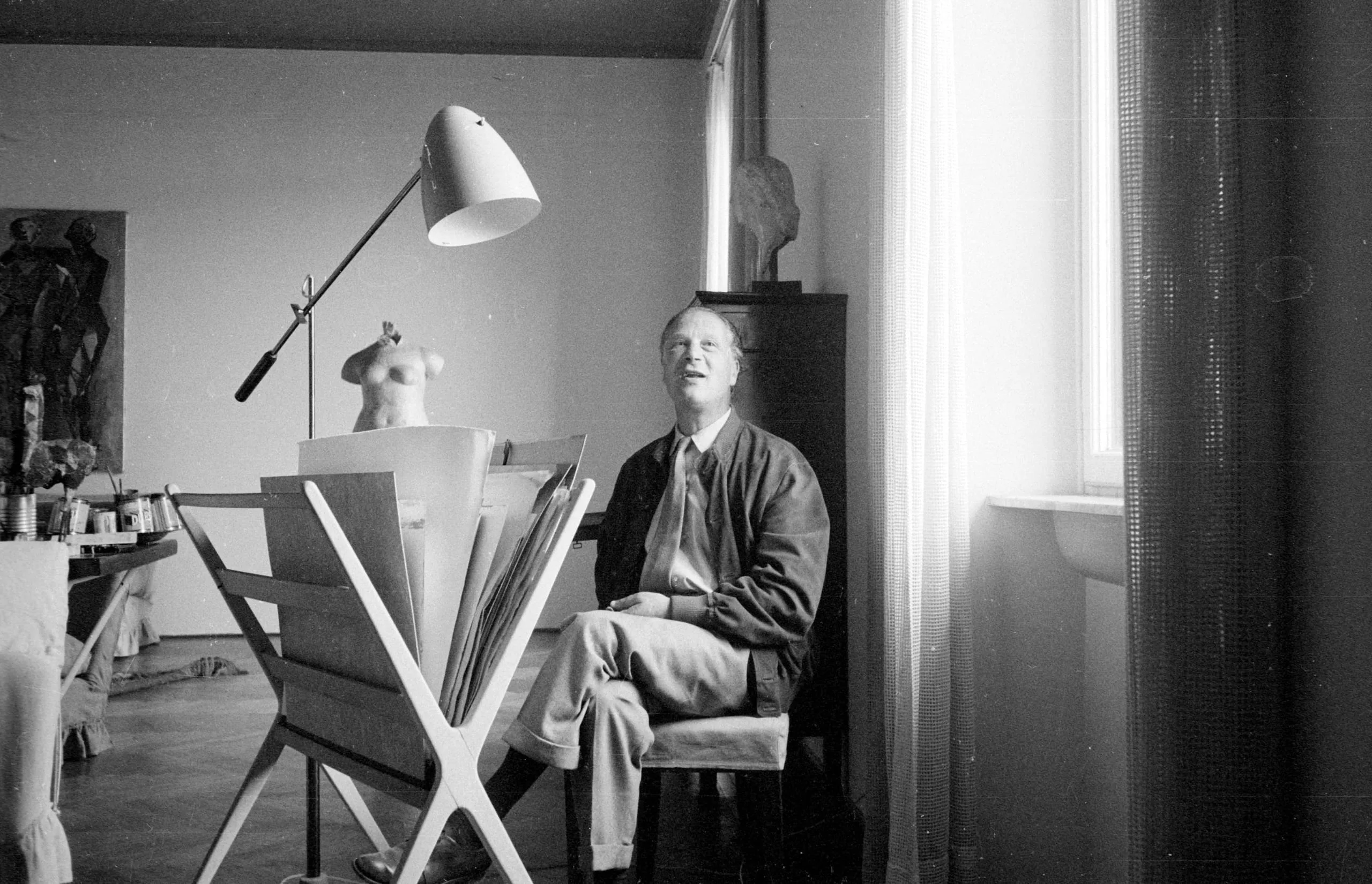 Black and white photograph of a laughing man seated in an artist's studio, surrounded by an easel, canvases, sculptural figures, and a long-armed lamp