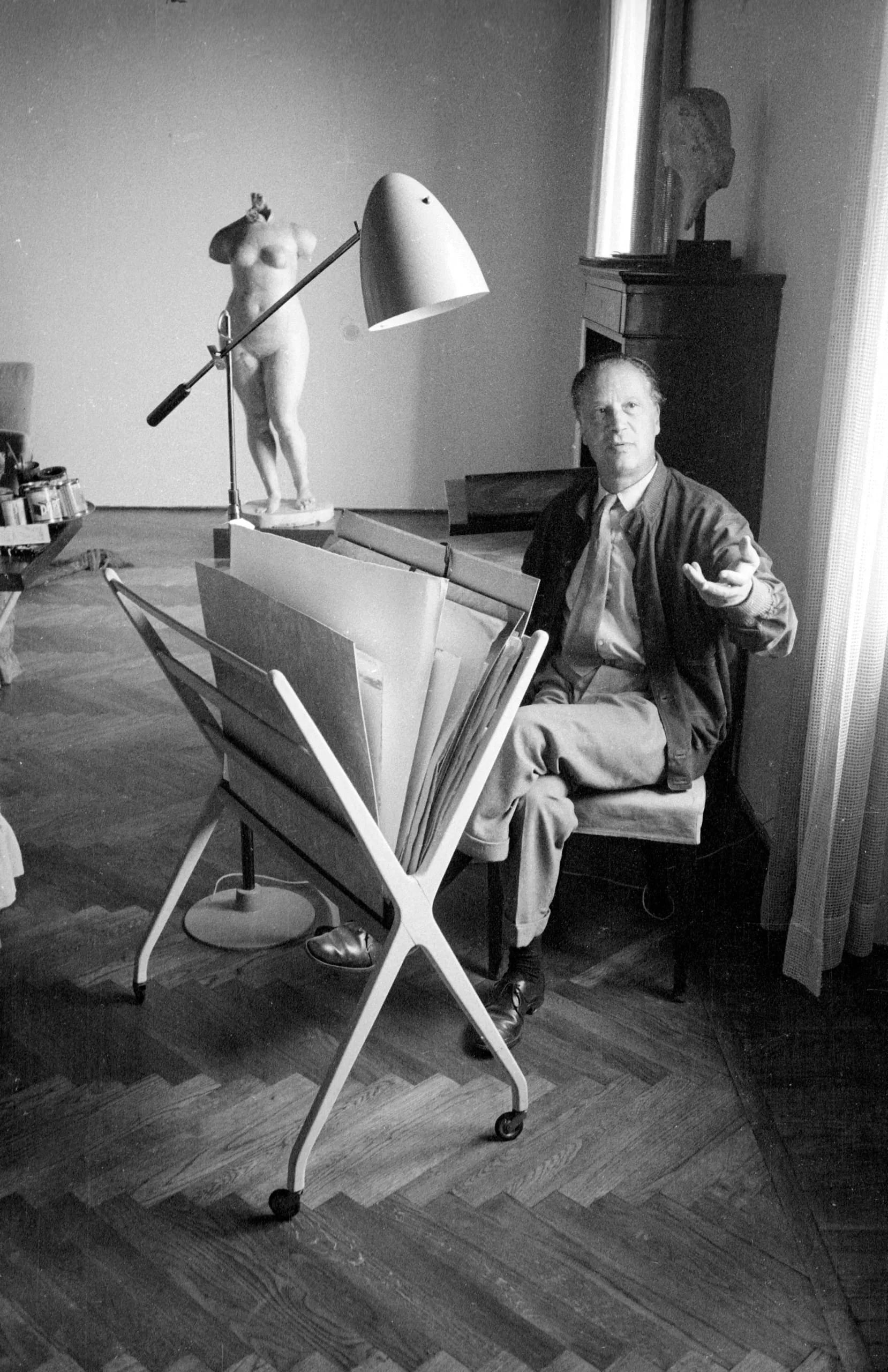 Black and white photograph of a man seated in a studio chair beside a portfolio rack, with sculptural figures and a cone-shaded floor lamp visible in the room