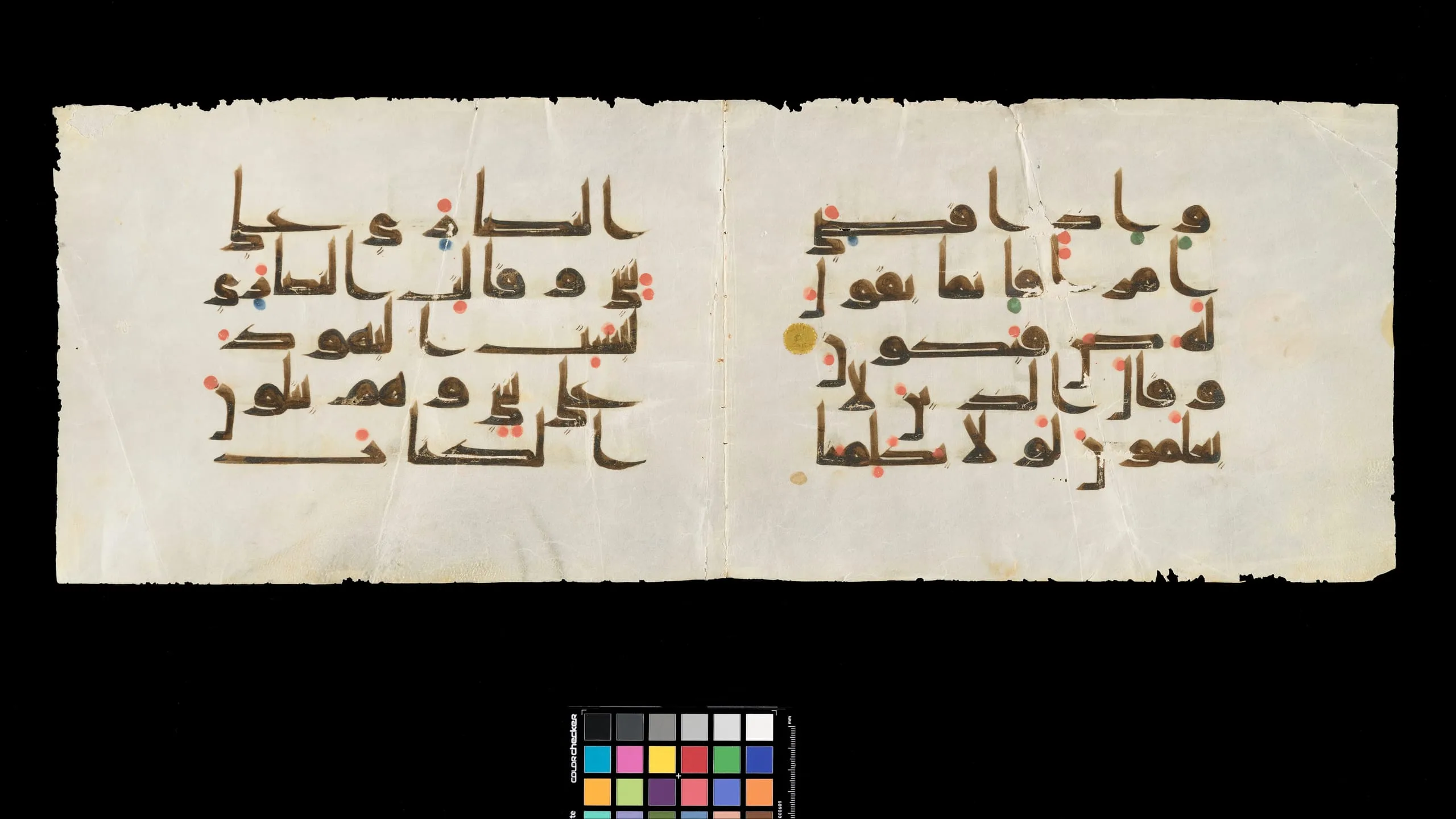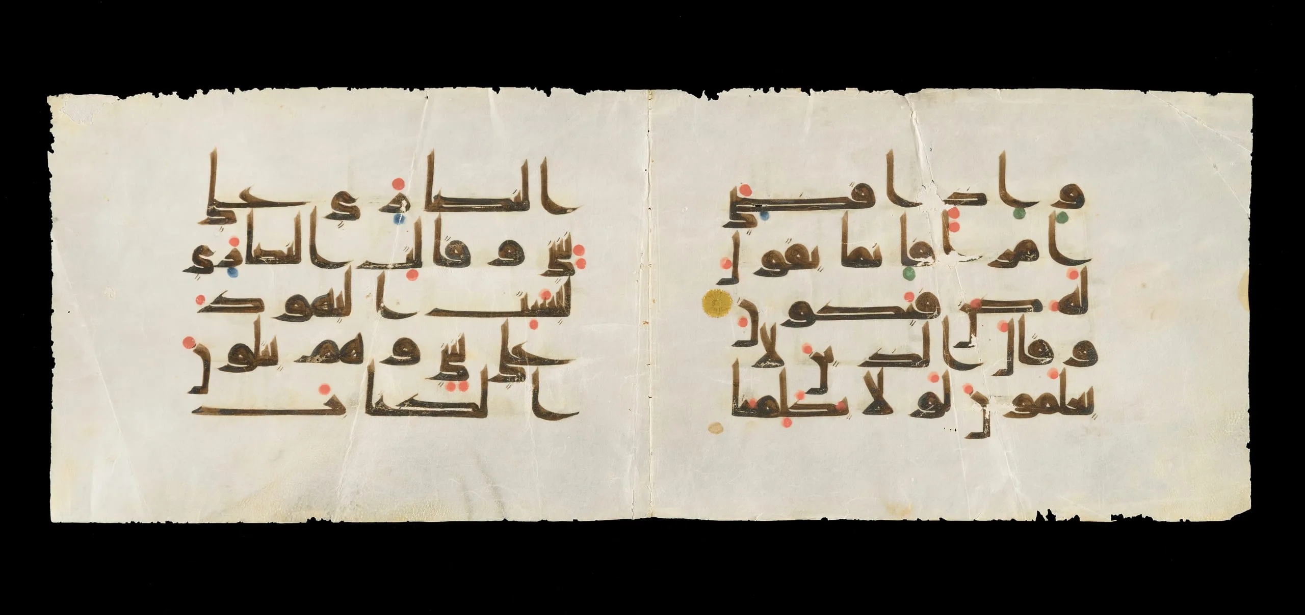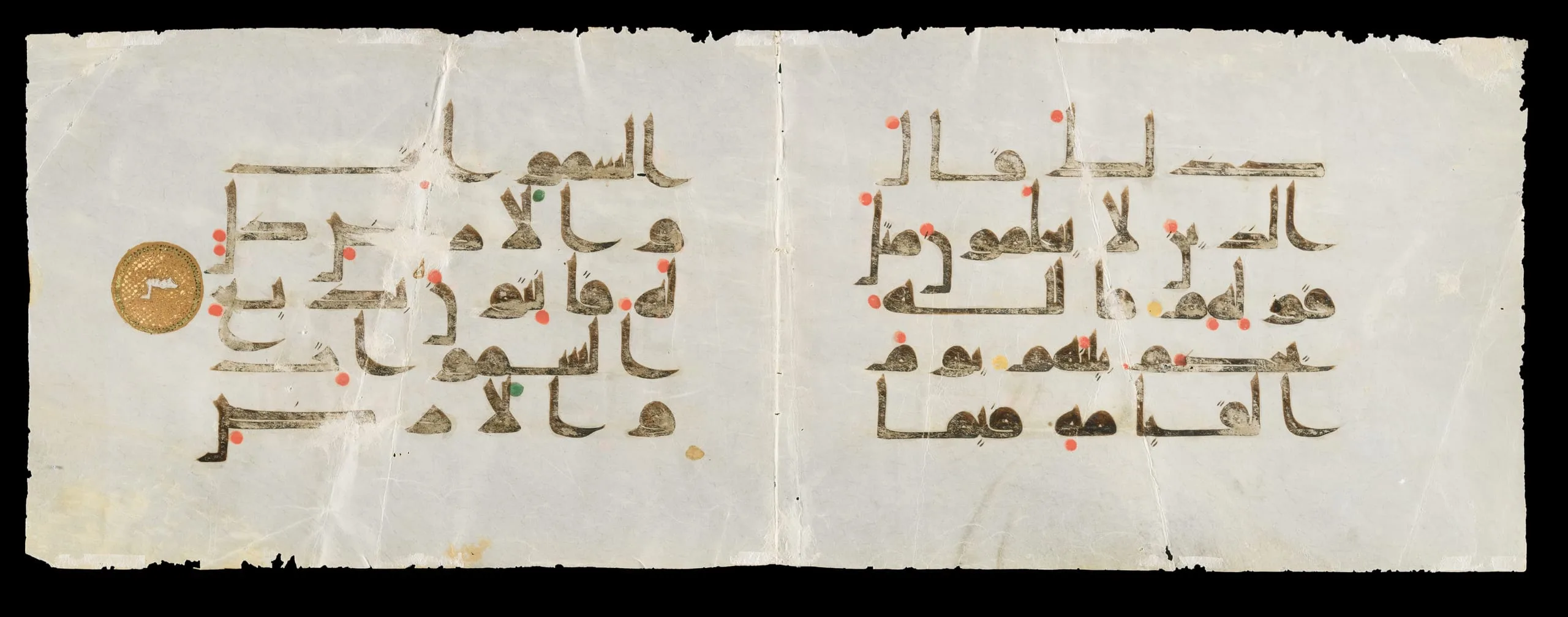 While the earliest surviving Qur’an manuscripts, from the second half of the seventh century, were written in a simple form of the Arabic script that lacks symbols for short vowels and certain consonants, scribes of the eighth and ninth centuries gradually introduced a system to mark these letter sounds. In this ninth-century double page, colored dots indicate different short vowels, while minute strokes distinguish between consonants of the same basic shape, helping to ensure an accurate recitation of the scripture. Gold medallions were also added to the calligraphy to indicate the ends of a verse or verse clusters, perhaps allowing readers to locate specific passages or keep track of which parts of the text they had covered.