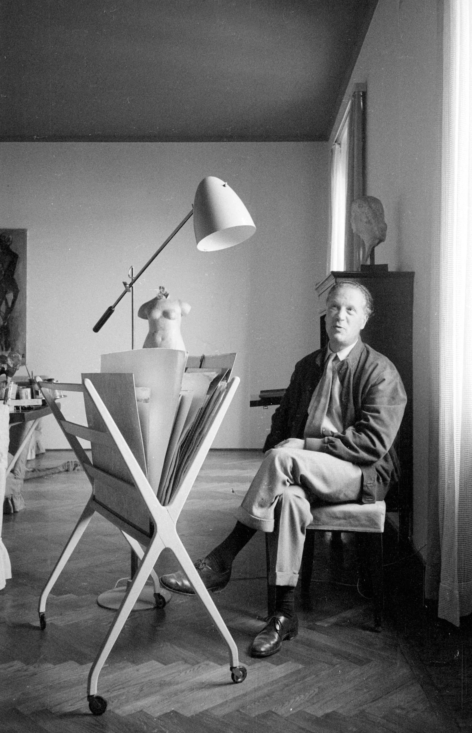 Black and white photograph of a man seated in an artist's studio, arms folded, surrounded by a portfolio rack, floor lamp, and small sculptural figures