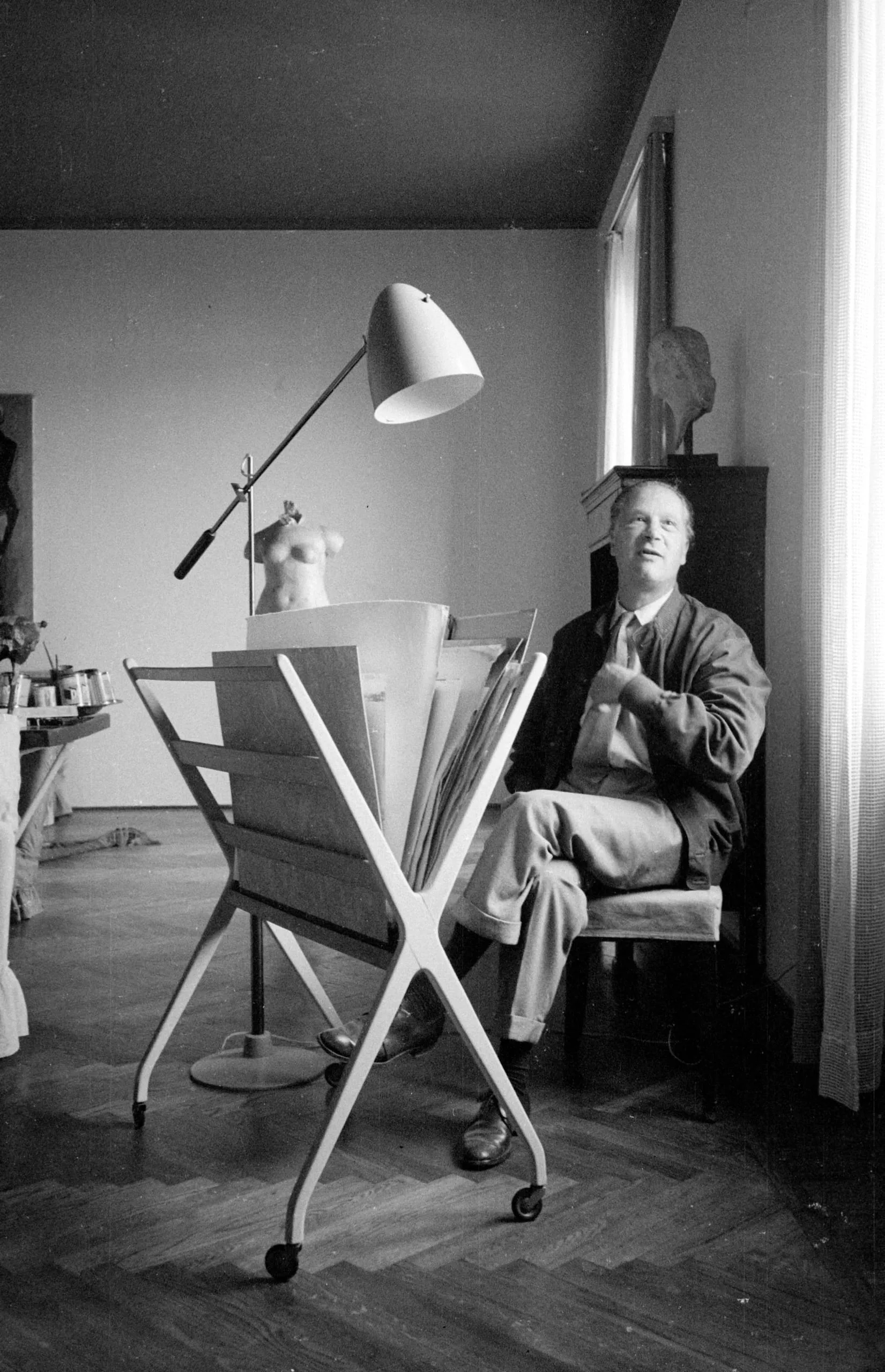 Black and white photograph of a man seated in a studio, head tilted back, surrounded by an art storage rack, floor lamp, and small sculptural figures
