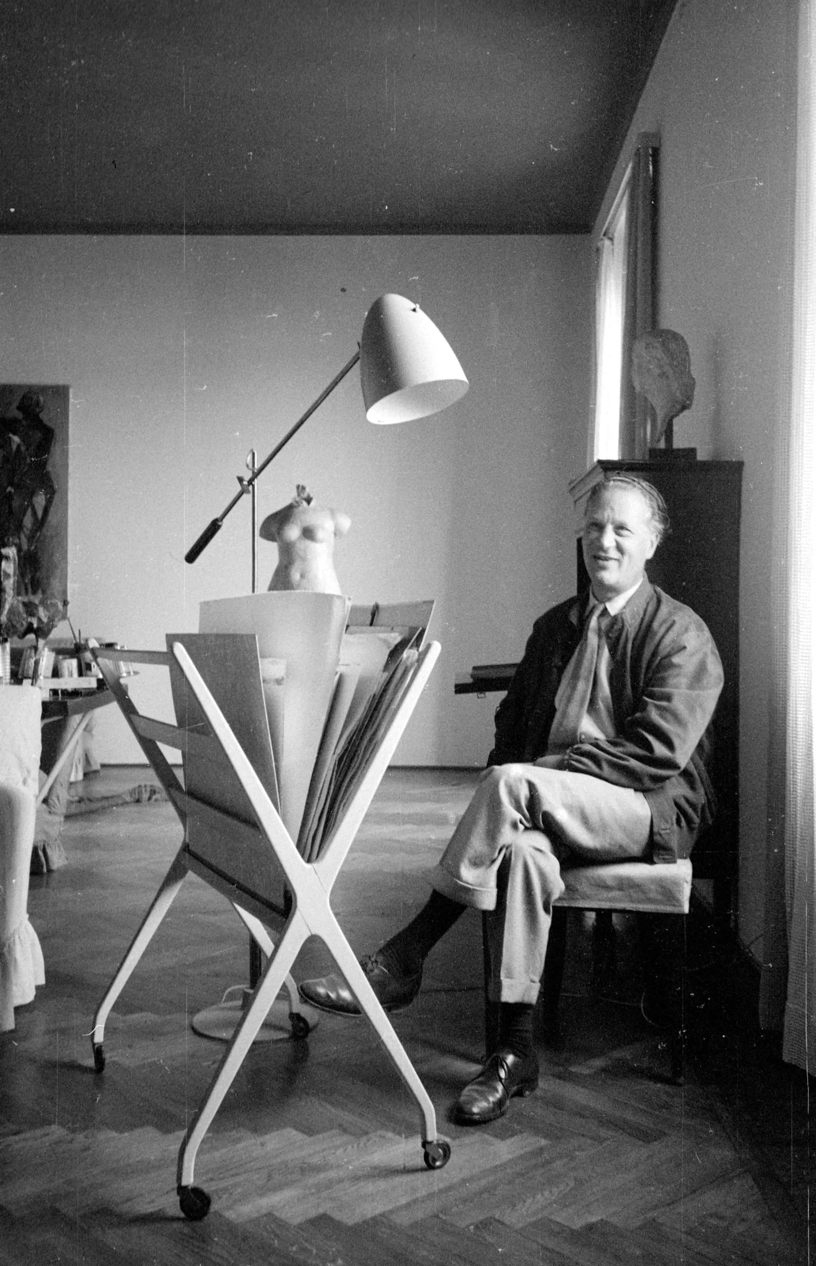 Black and white photograph of a smiling white man seated cross-legged in a chair inside an artist's studio, with a print rack, floor lamp, and small sculptures nearby
