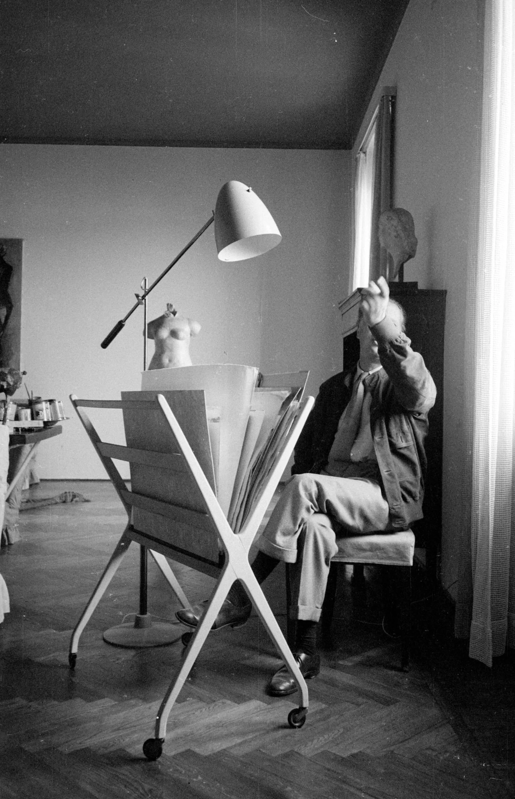 Black and white photograph of an older white-haired man seated in an artist's studio, holding a small object up to examine it, surrounded by a drafting stand, sculptural figures, and a cone-shaded floor lamp