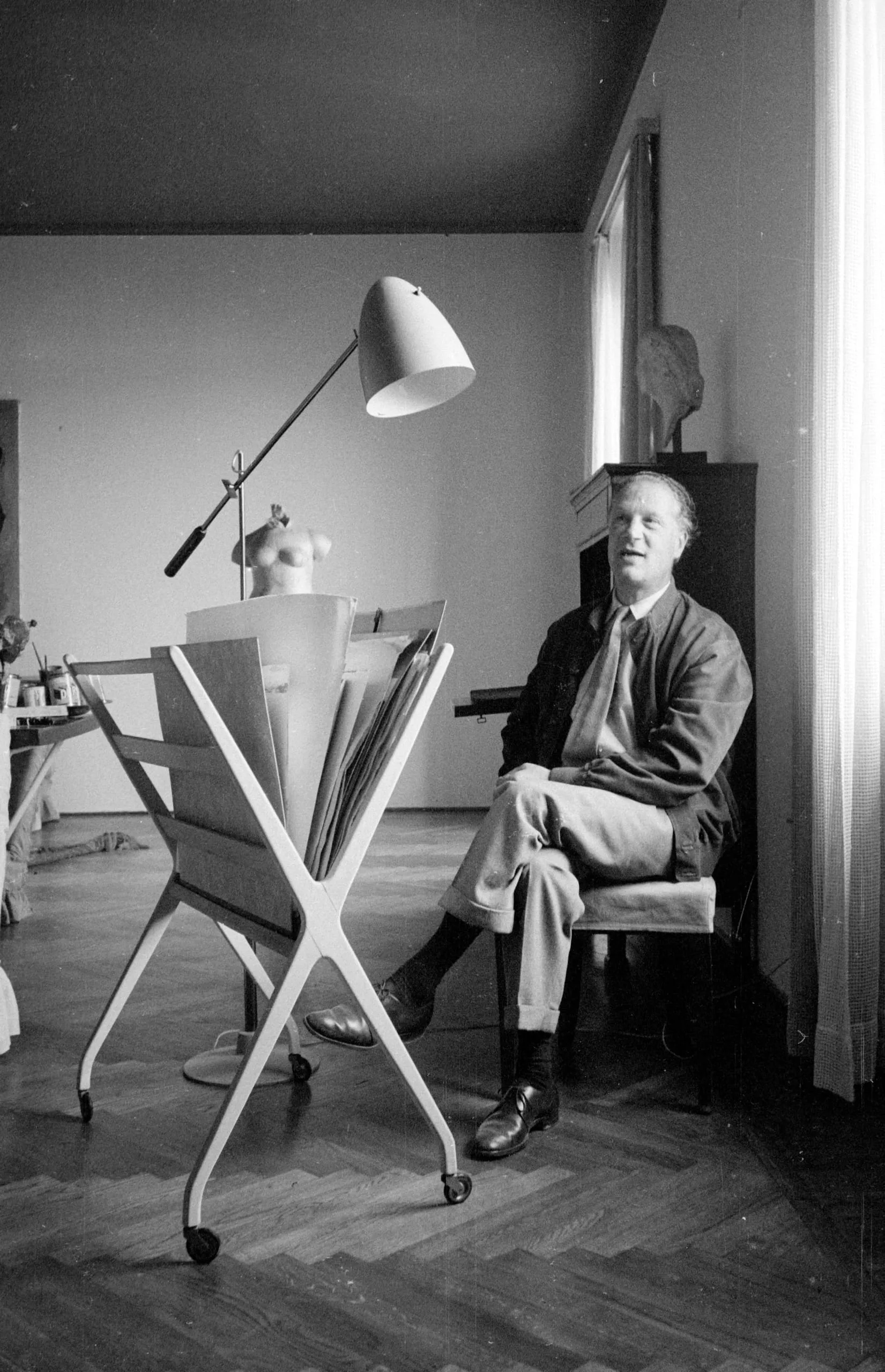 Black and white photograph of a man in a sport coat seated in a studio, with an X-frame rolling easel, adjustable lamp, and sculptural forms nearby