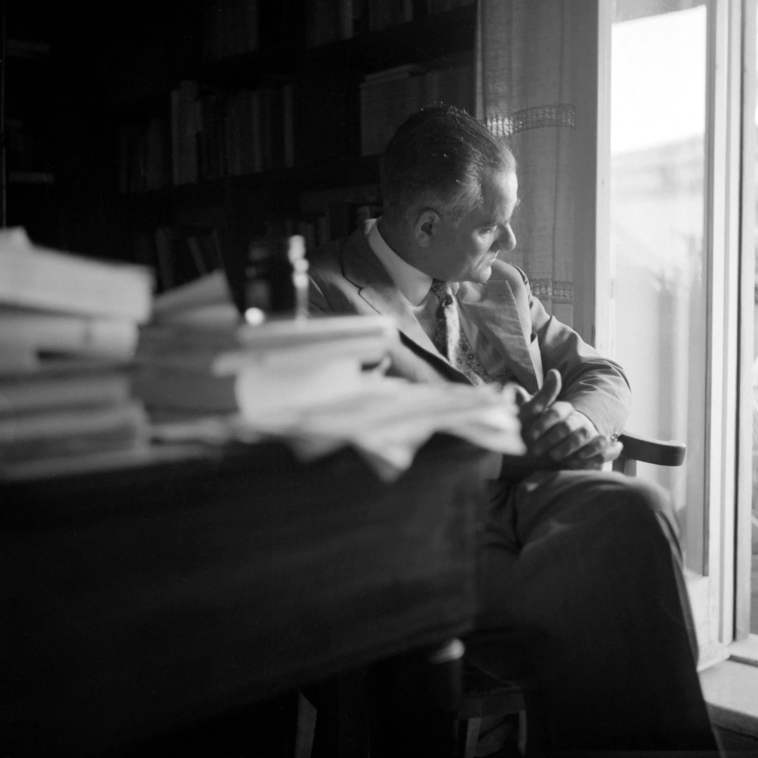 Black and white photograph of a Black man in a suit and tie seated beside a bright window, surrounded by stacked papers and bookshelves