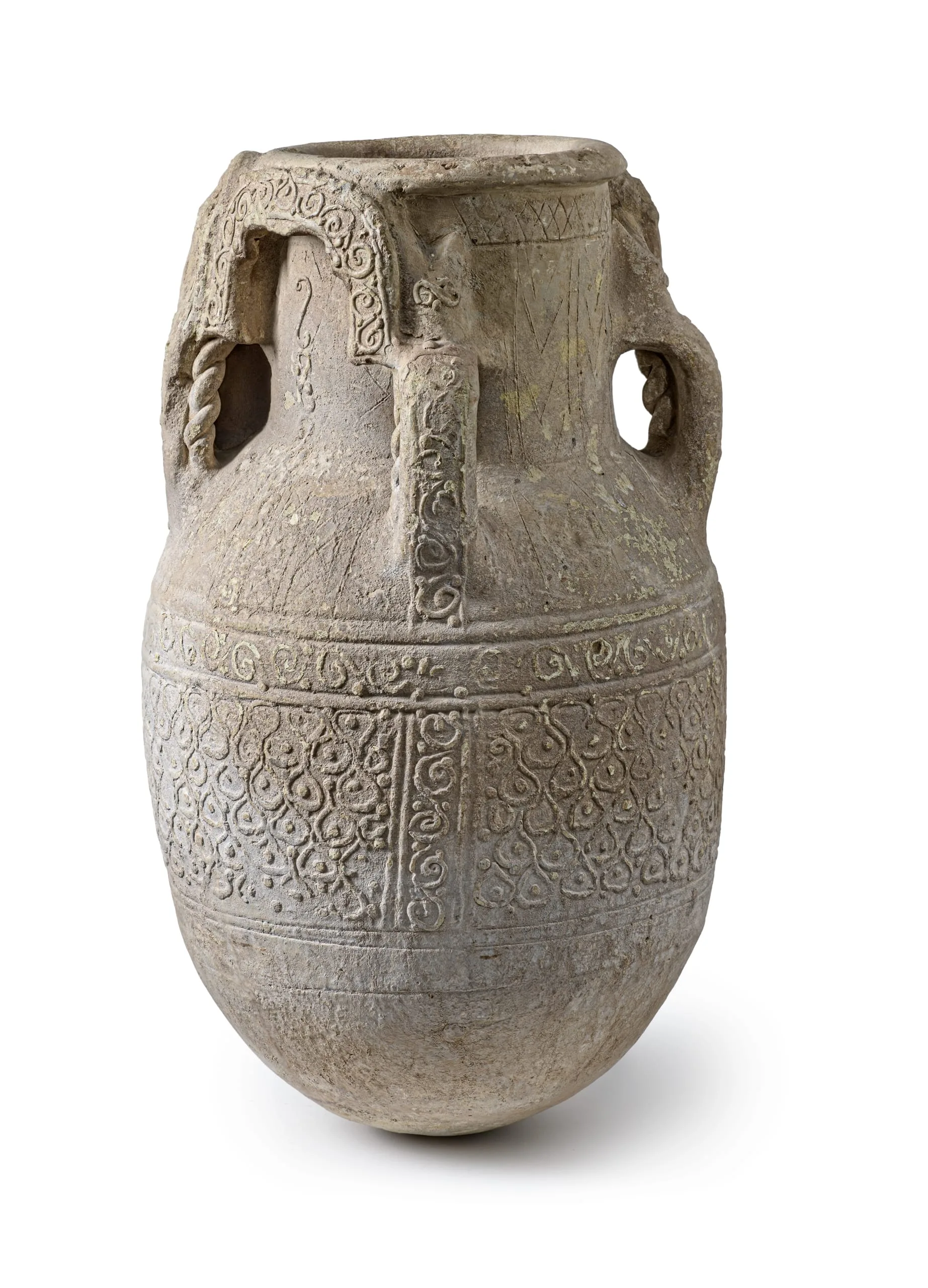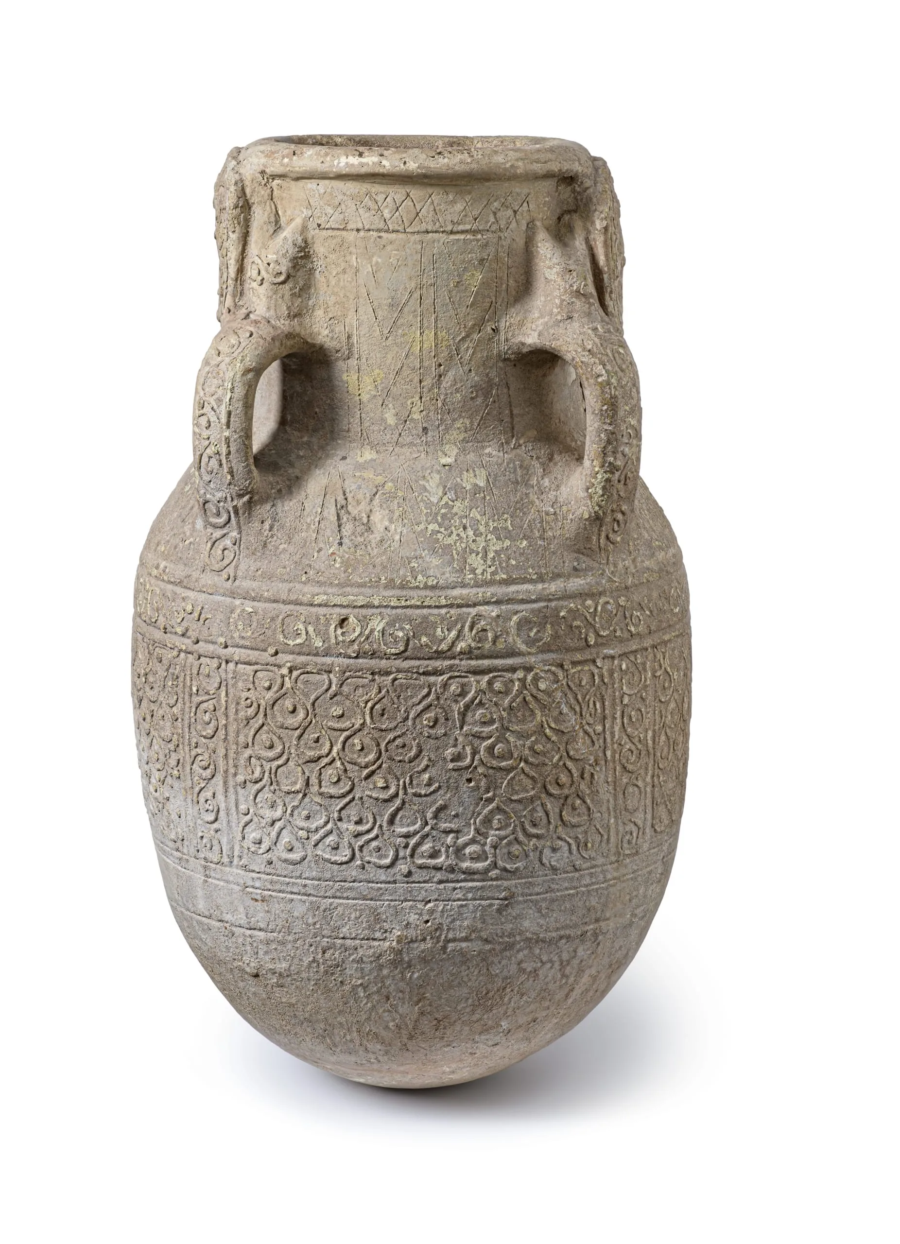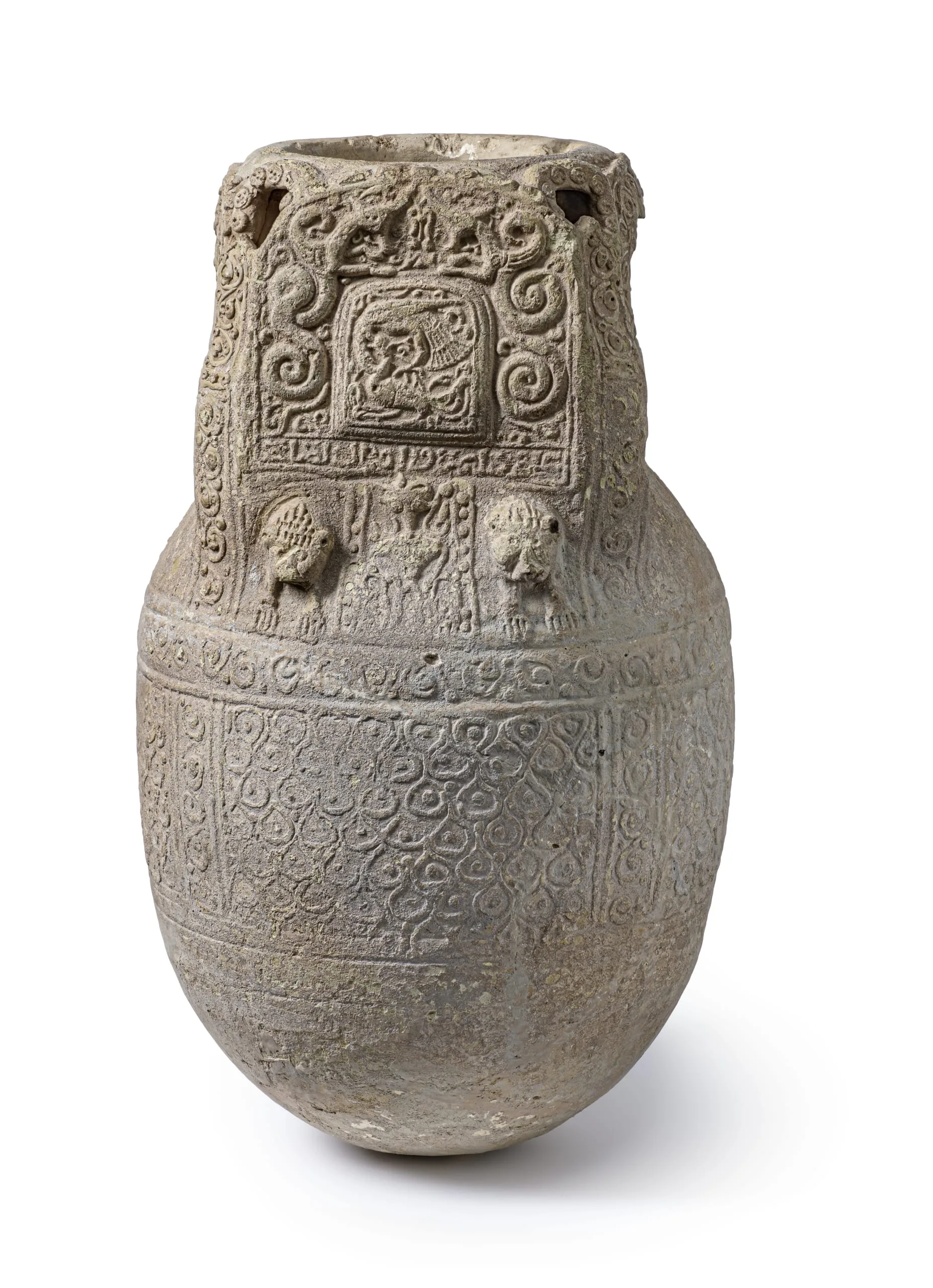 This type of unglazed jar, or habb, served as a water cistern. Because of its ungainly ovoid shape with rounded bottom, it would have been placed in the ground or set on some form of support in order to stand upright. Water vessels of this type (also see M.73.5.710) were typically covered with relief decoration combining abstract and figural motifs that were left unglazed, so that their porosity allowed not only for the filtering of impurities but also for evaporation, which kept the water cool.