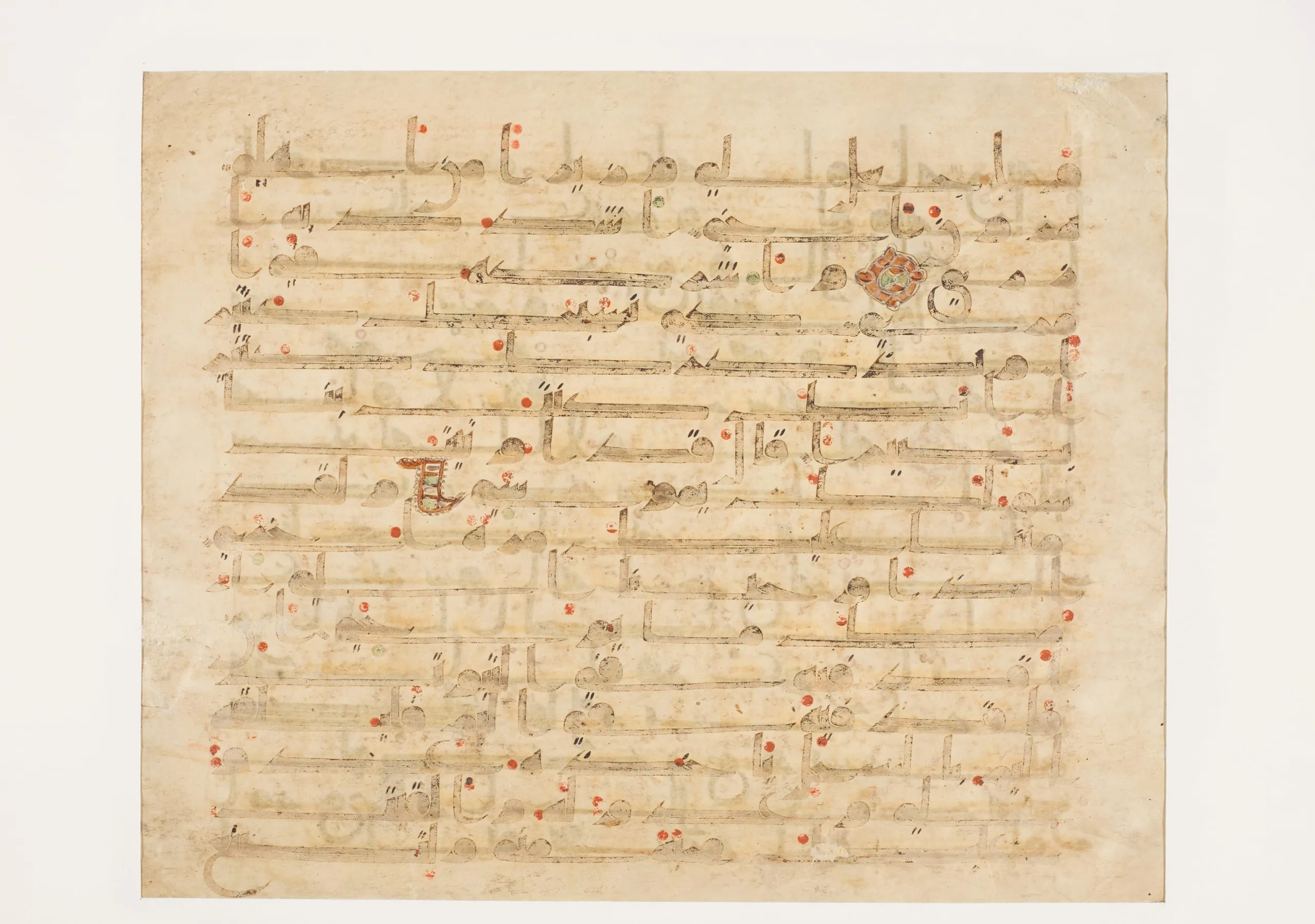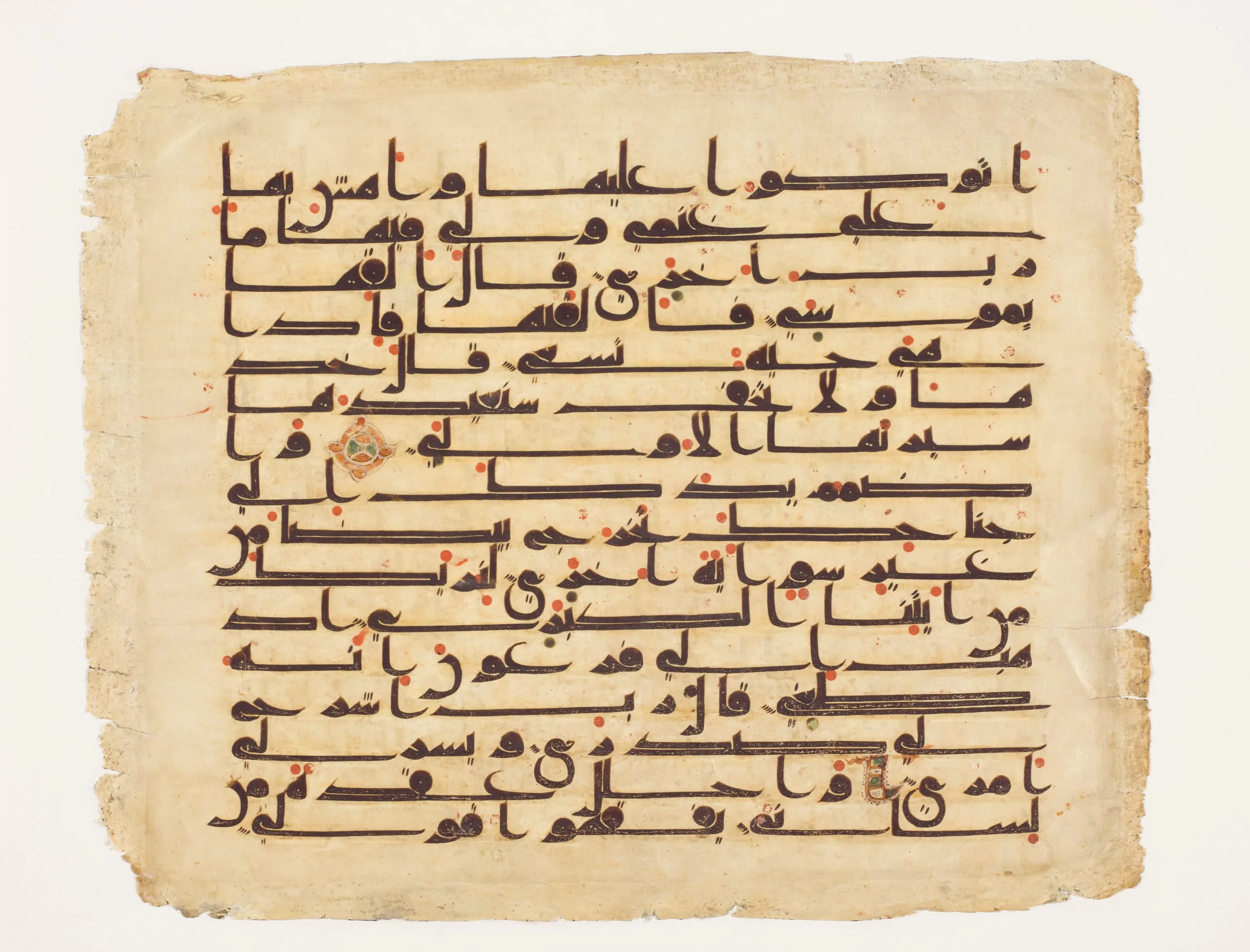 http://collections.lacma.org/node/240038) confirm their belonging to the same now-dispersed manuscript. Unlike some contemporaneous manuscripts of the Qur’an with just five lines of text and considerable spacing between words (see M.2002.1.24,