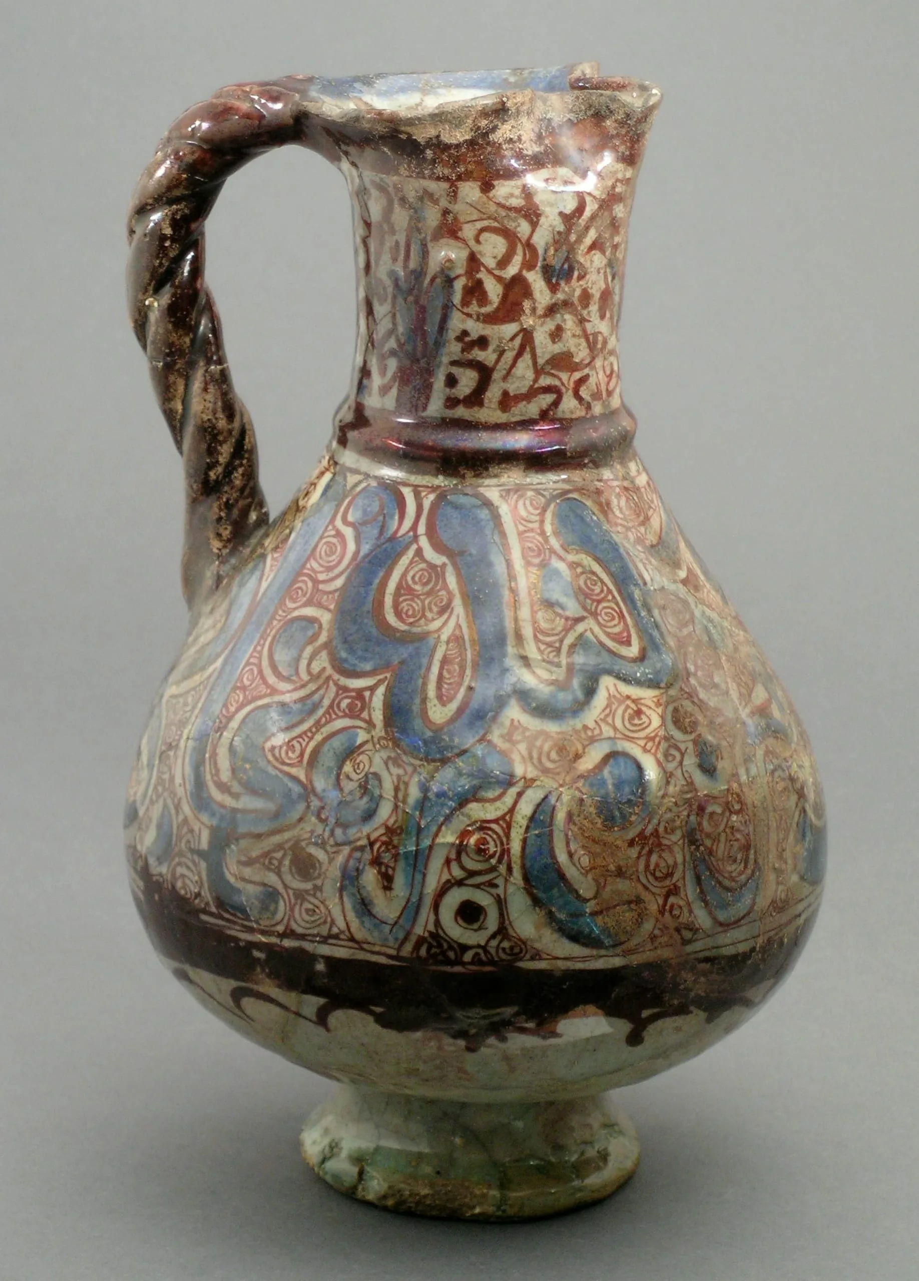 Ceramic pitcher with bulbous body, twisted handle, and cream glaze decorated with sweeping blue calligraphic forms and rust-red scrollwork, showing age and wear