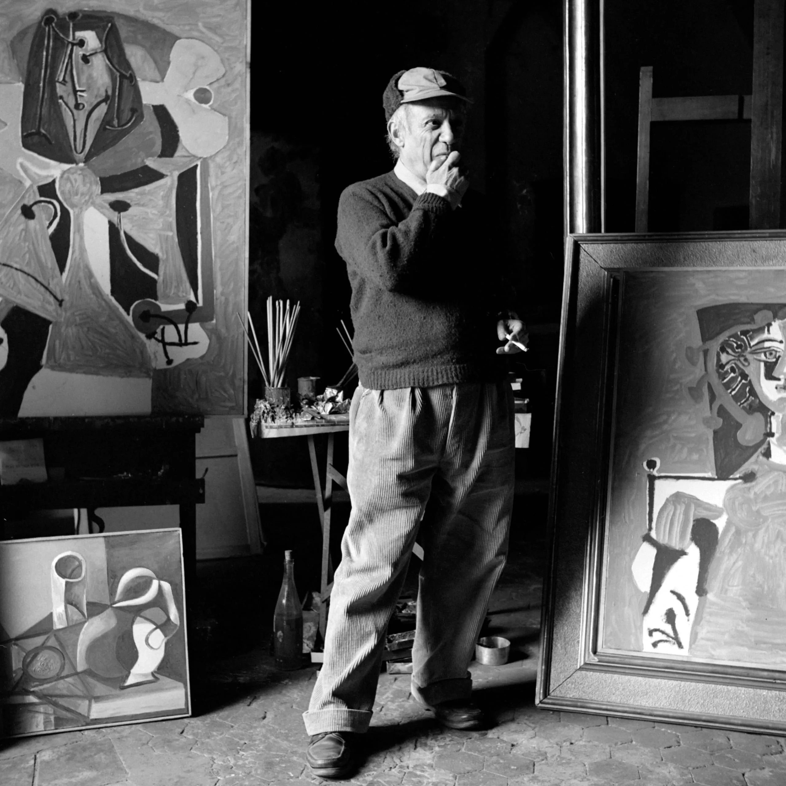 Black and white photograph of an older man in a flat cap and sweater standing among large abstract paintings in an artist's studio, hand raised to his chin