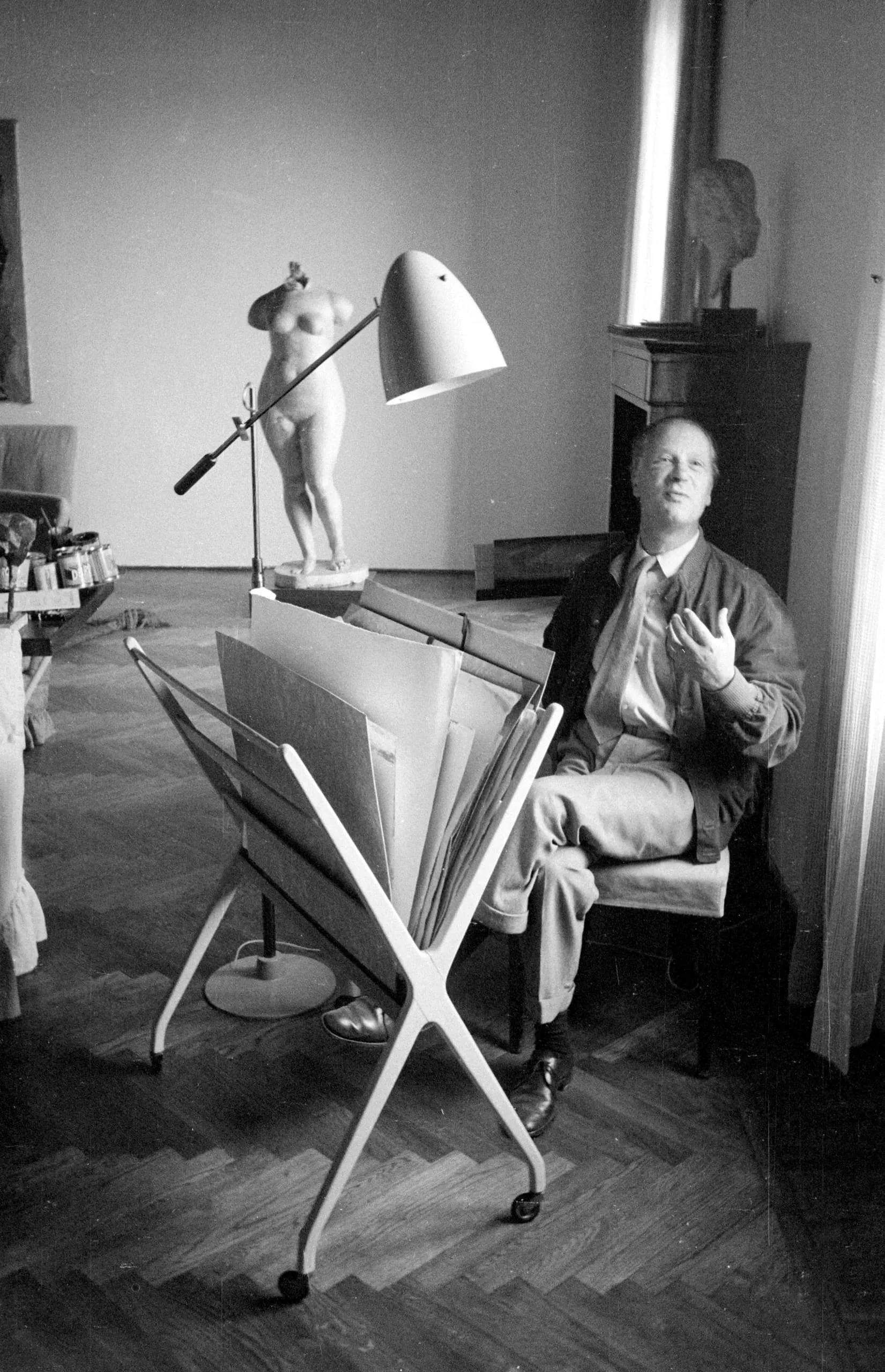 Black and white photograph of a white man seated in an armchair, looking upward with one hand raised, surrounded by a lamp, sculpture, and a rack of canvases in a studio interior