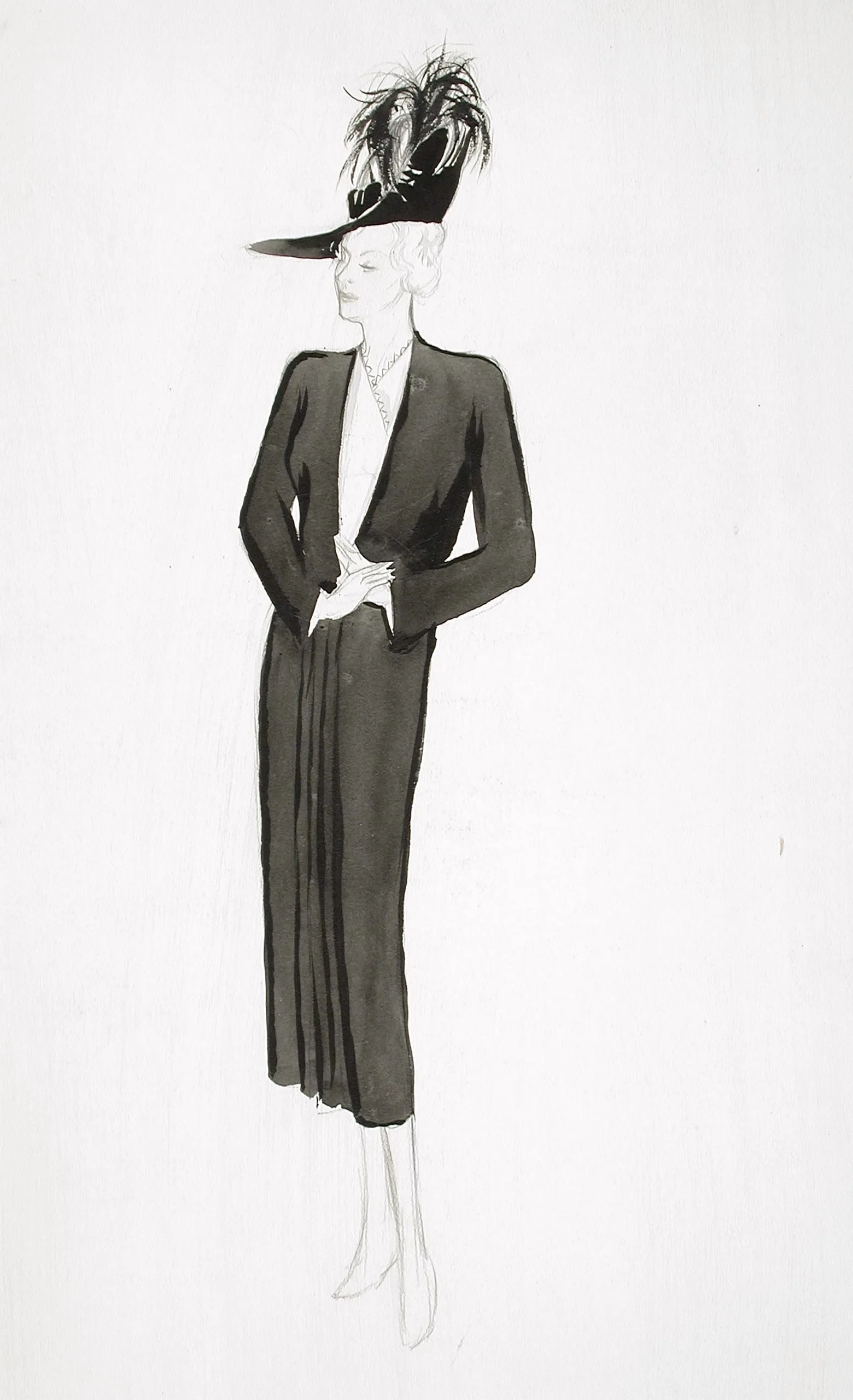 Fashion illustration in black ink wash and pencil showing a full-length female figure in a dark jacket, midi skirt, and wide-brimmed hat with feathers