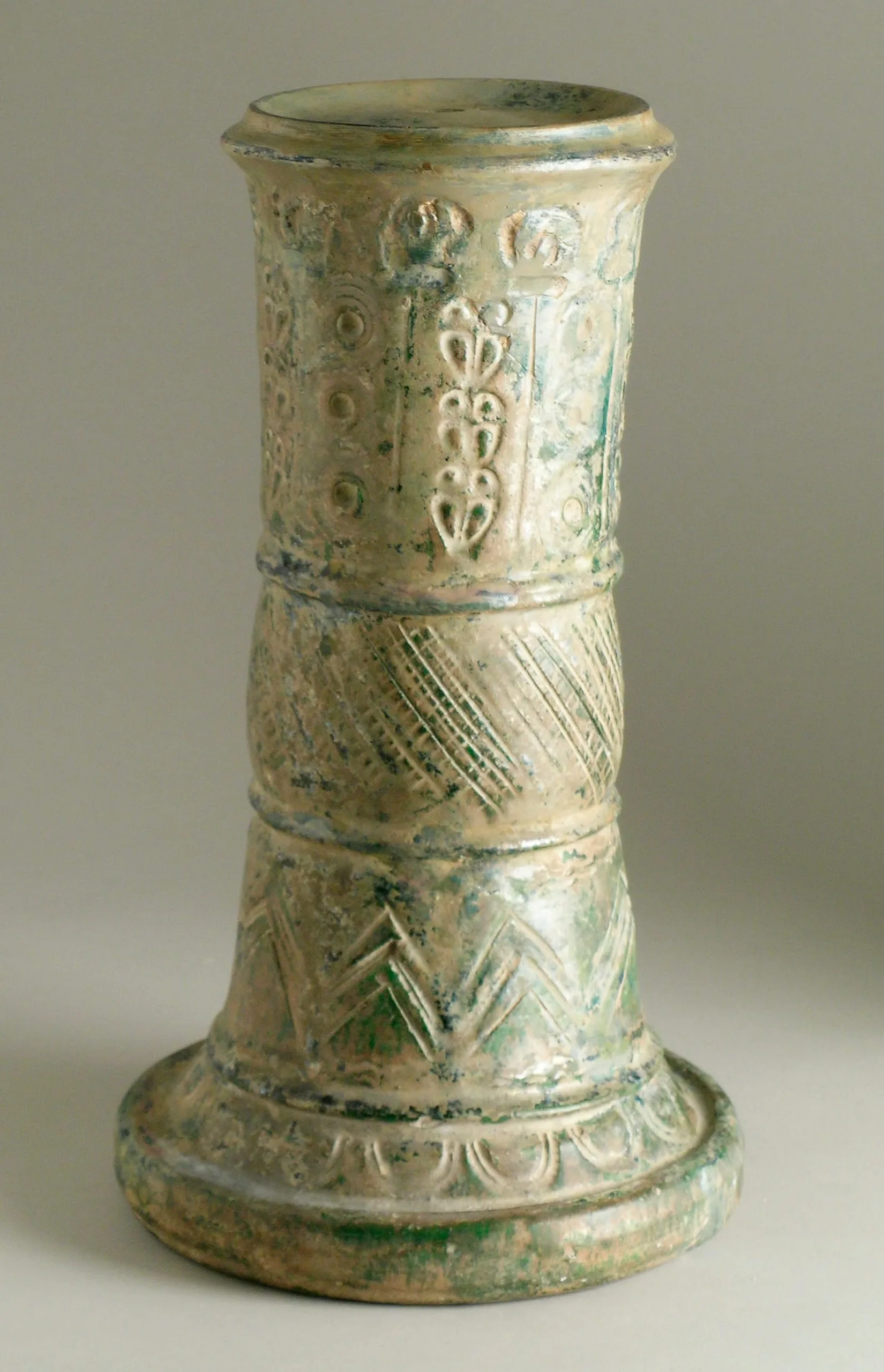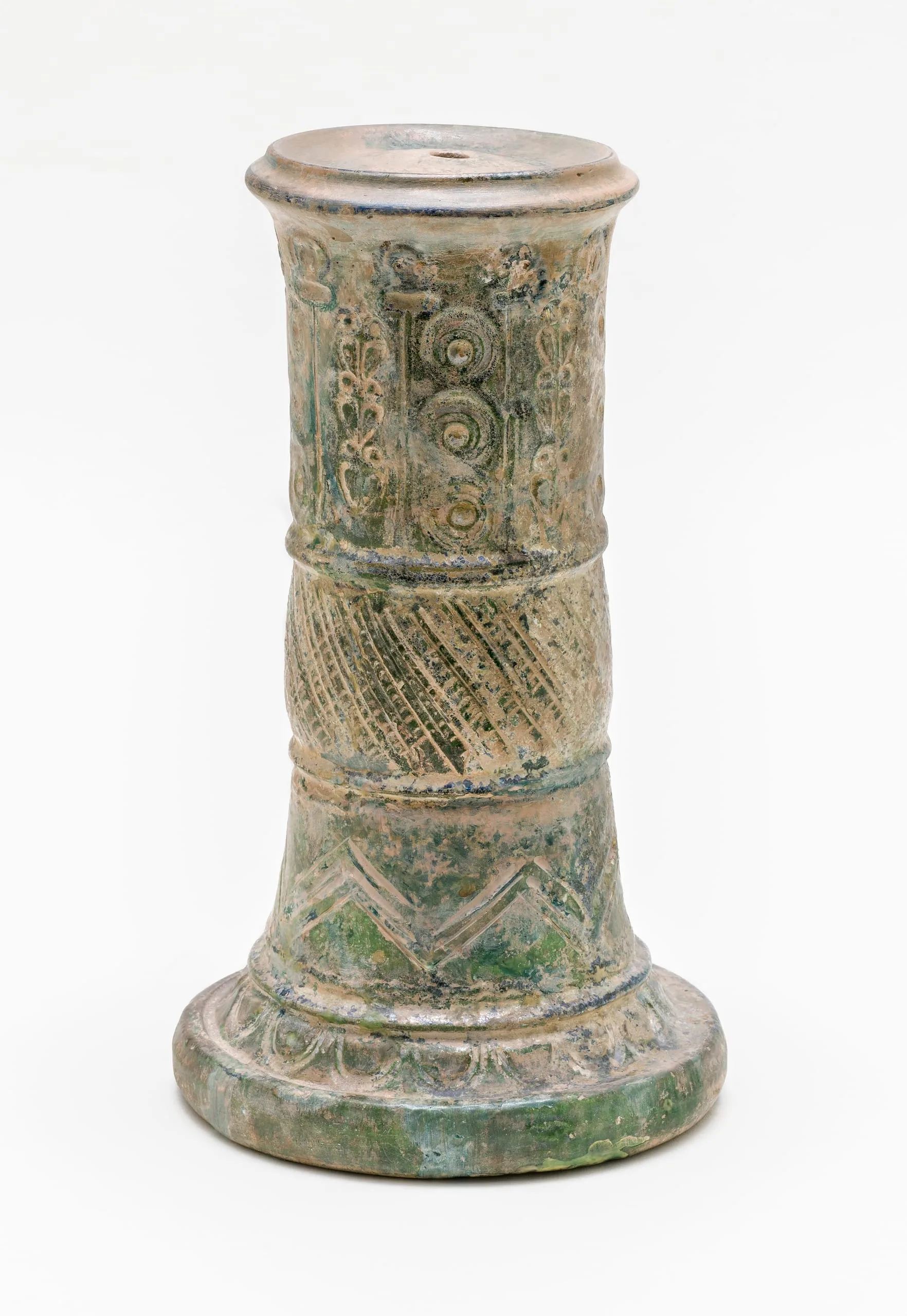 The tall lampstand, which once supported a smaller oil lamp on its upper surface, is one of several types of lighting devices in the Iranian world (also see M.81.192.1a-c). This pillar-shaped ceramic example is a rare survival from the eighth century, and the longevity of its columnar form is attested by brass equivalents made eight hundred years later (see M.2002.1.10).