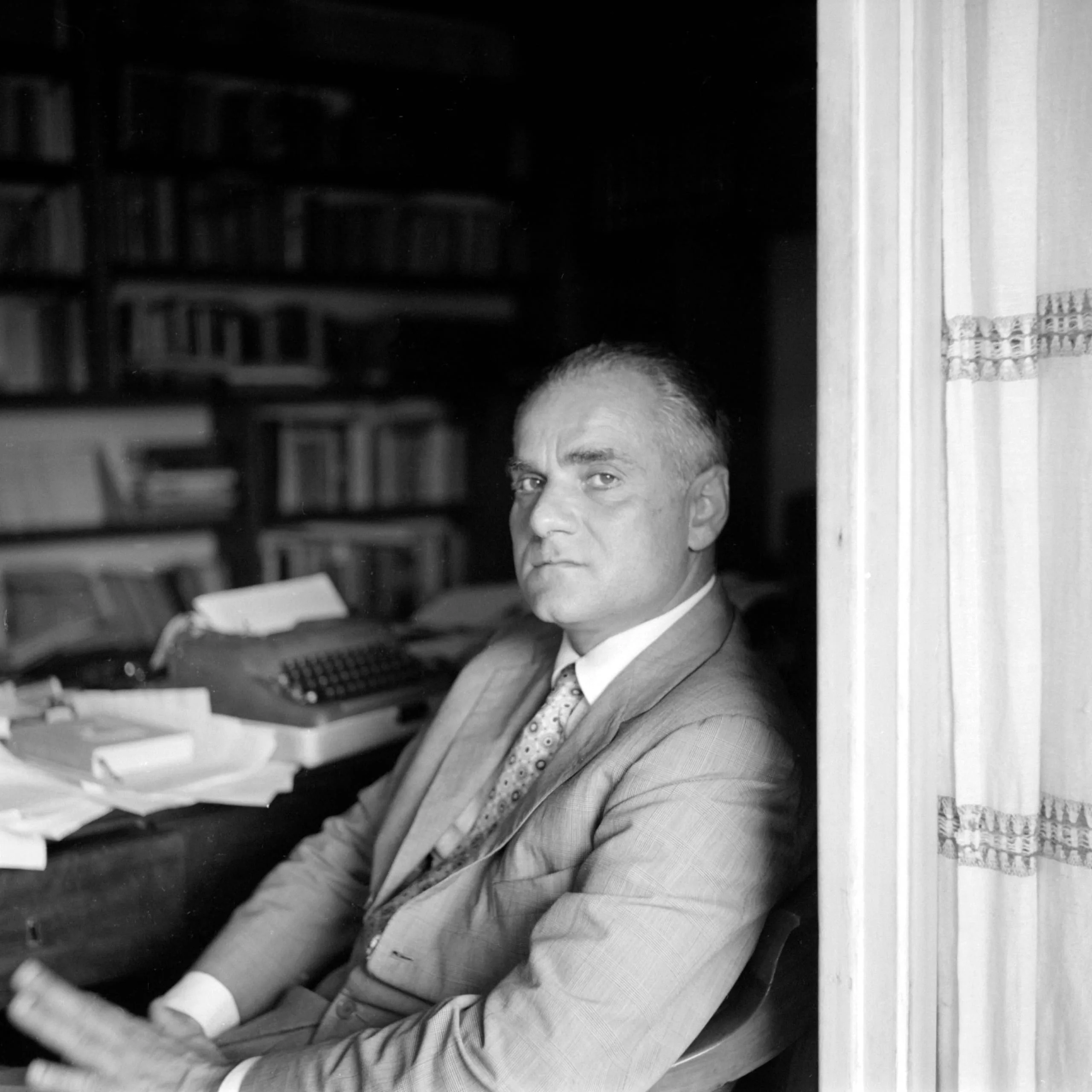 Black and white portrait photograph of a white man in a light suit and patterned tie, arms crossed, seated at a desk with bookshelves and a typewriter visible behind him